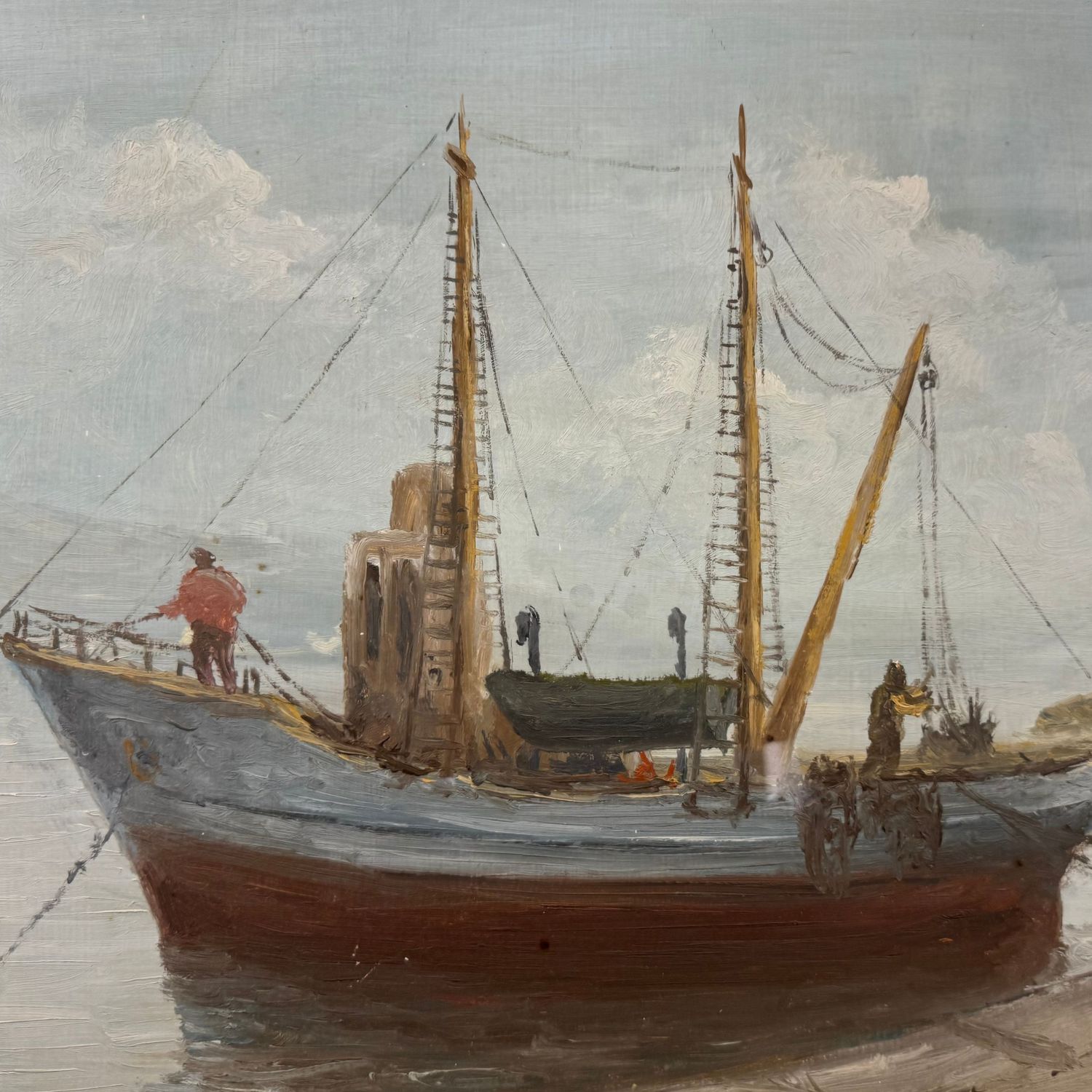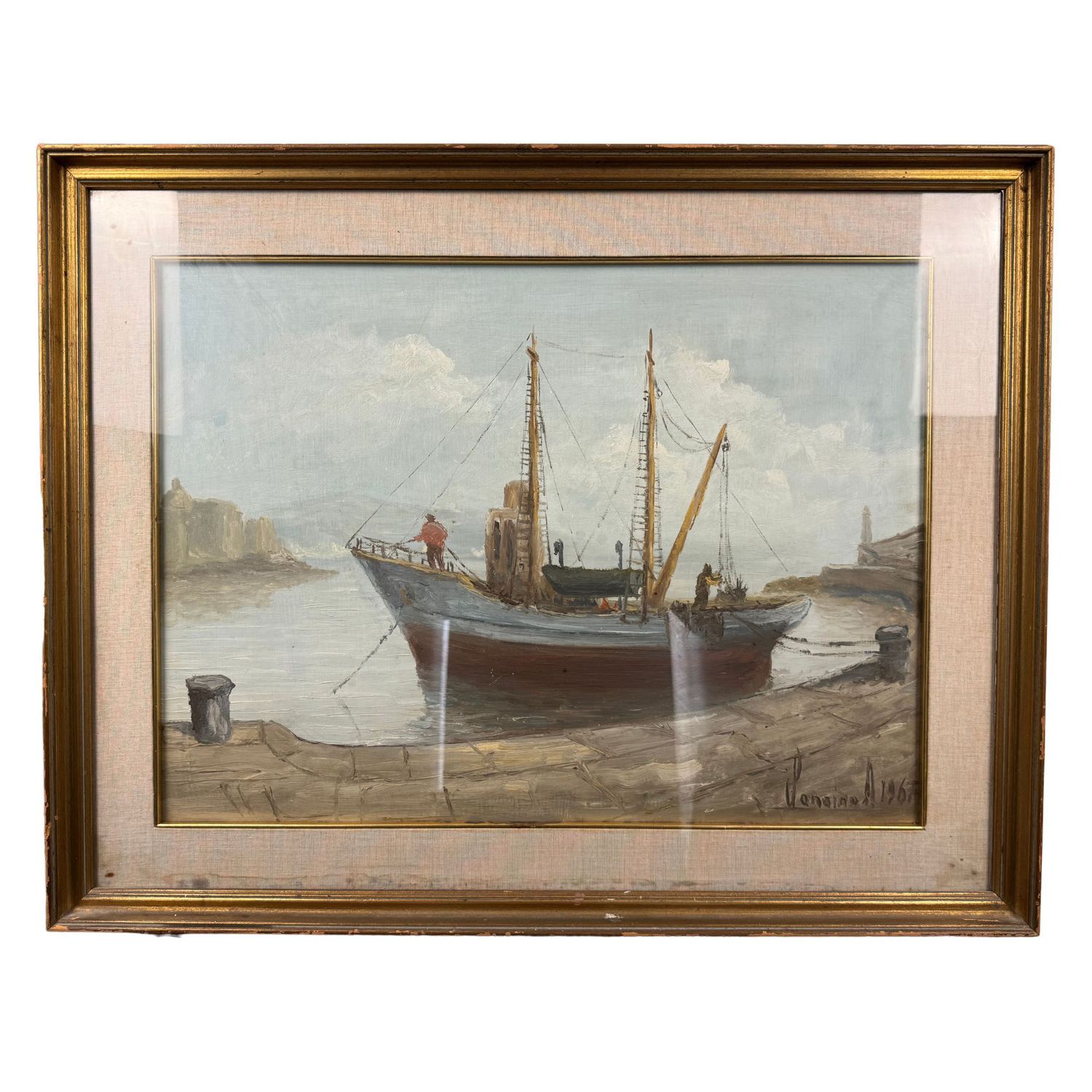 Dipinto olio su pannello, periodo XX secolo scuola Italiana, raffigurante Marina con barca a Torre del Greco.