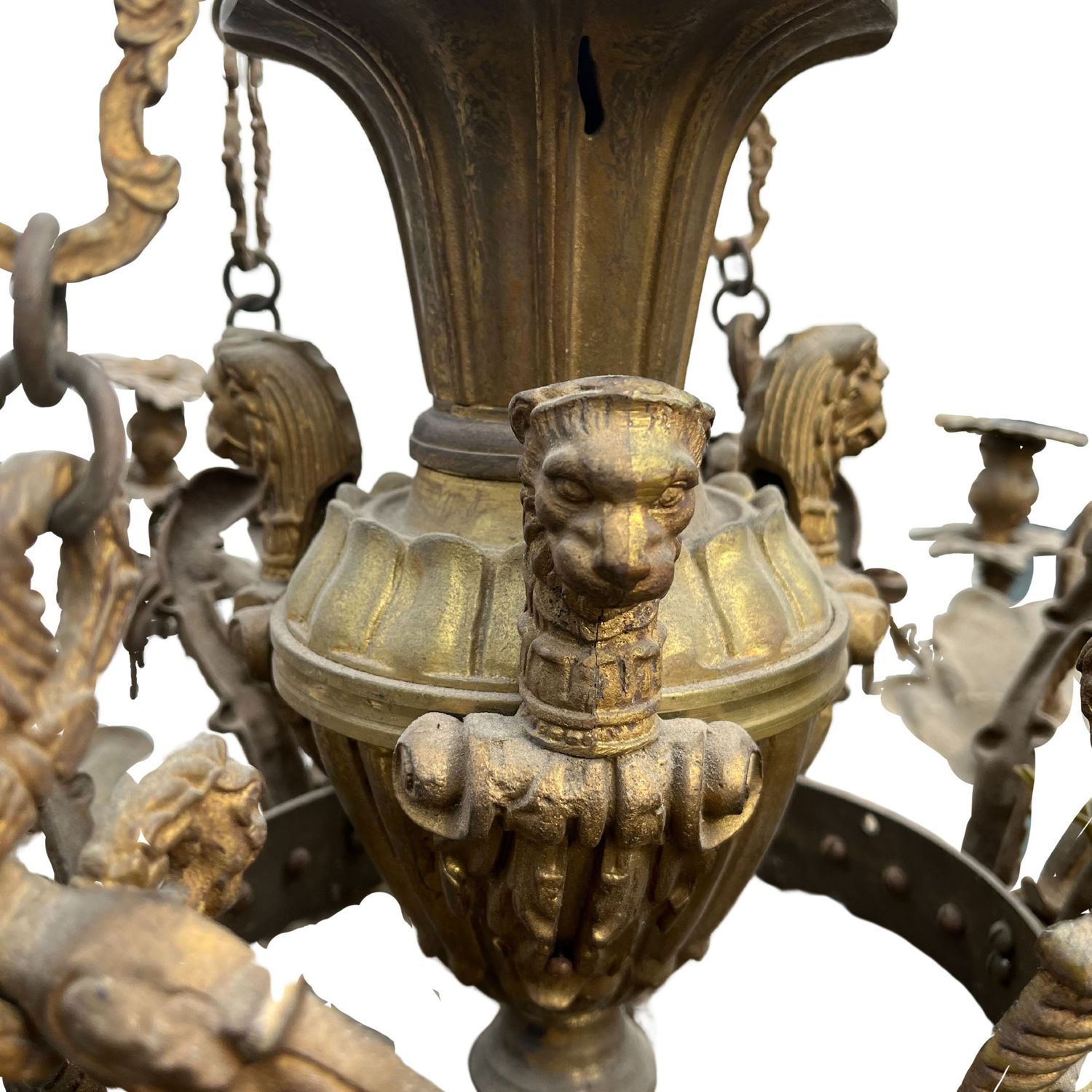 Importante lampadario in bronzo dorato finemente cisellato, composta da 18 braccia porta candele, sorretto da catena dorata, ornato da palme, con tre piccole sculture raffiguranti leoni.
