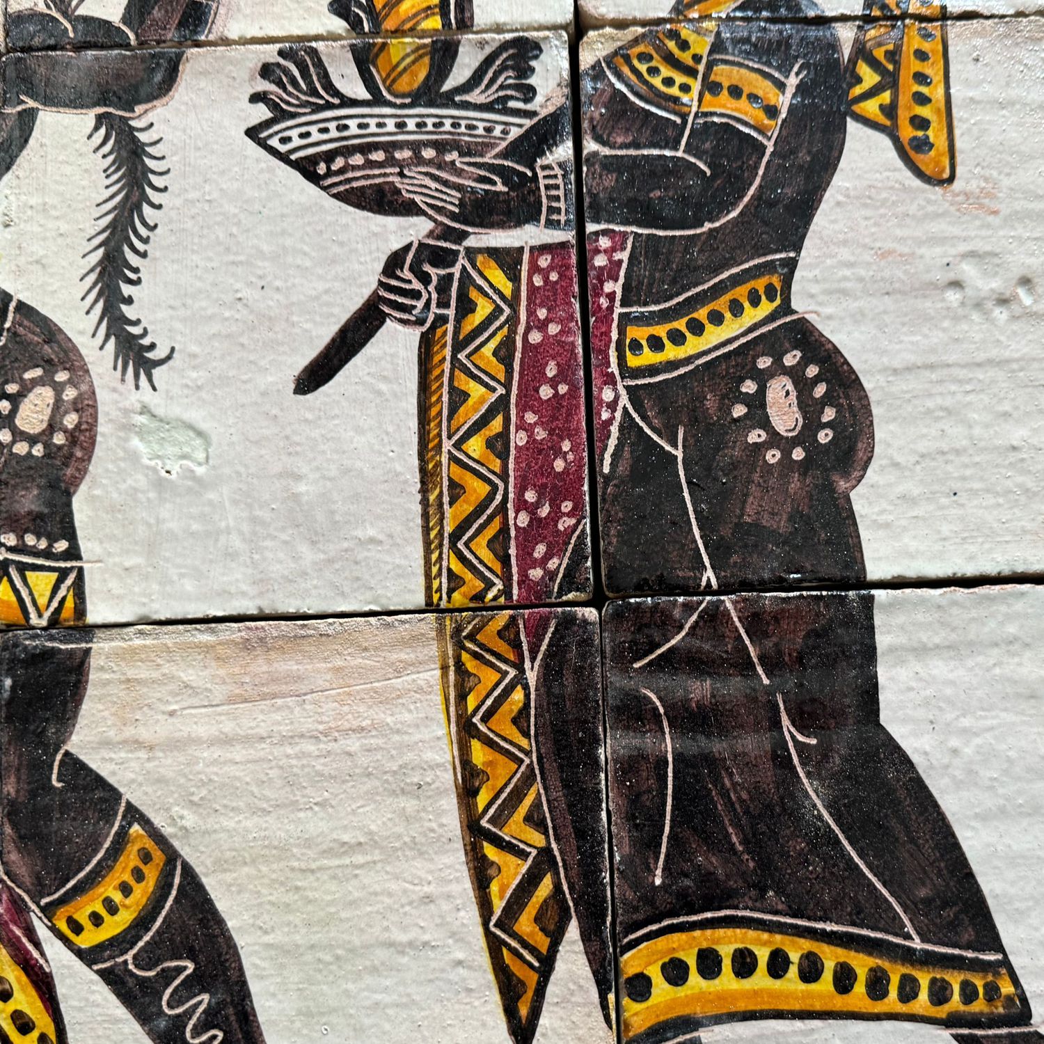 Composizione artistica composta da 9 mattonelle in terracotta smaltate e decorate a mano, con scena pompeiana, periodo XIX/XX secolo.