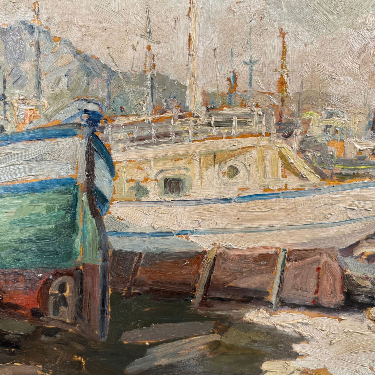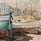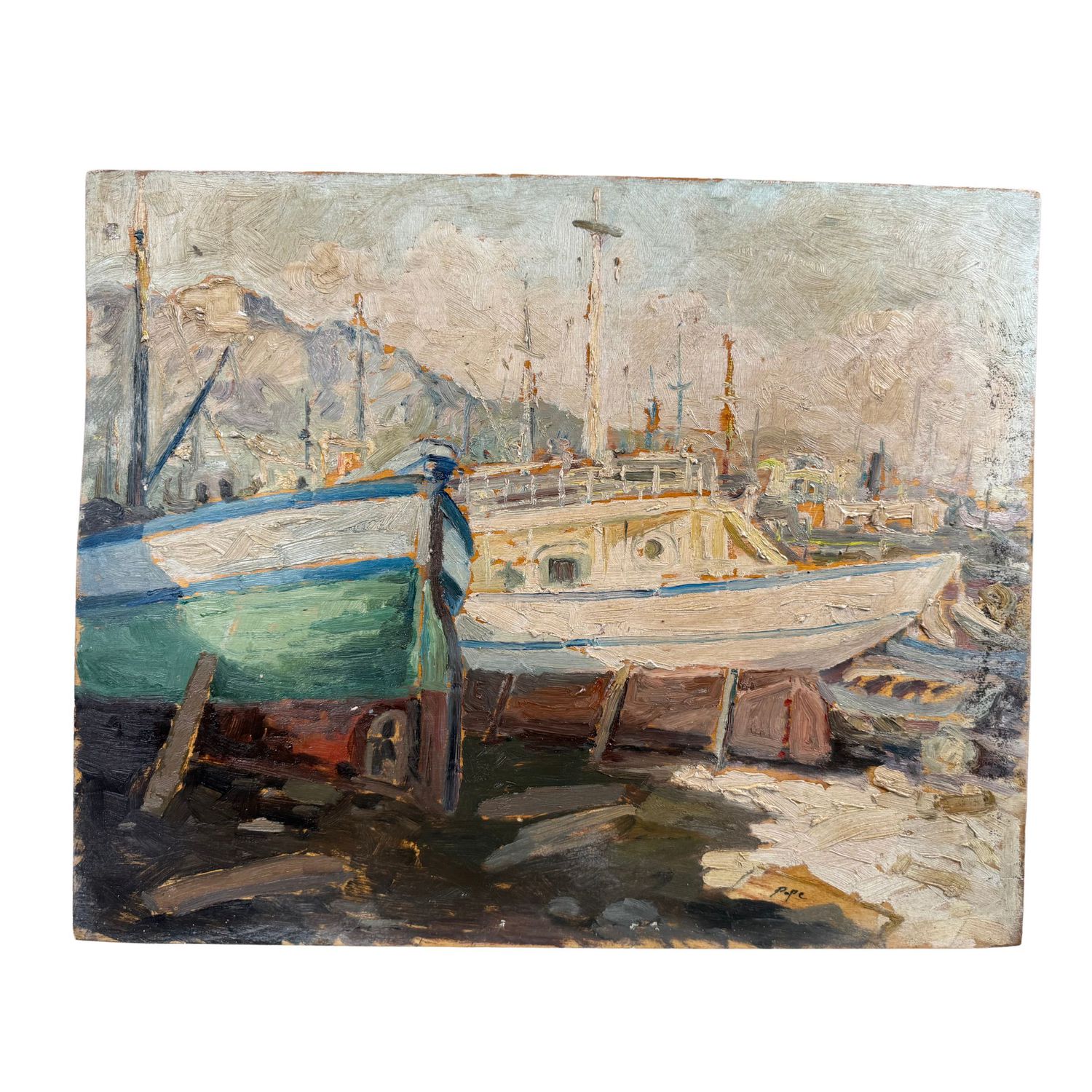 Dipinto olio su tavola, periodo XX secolo scuola Italiana raffigurante Barche a secco.