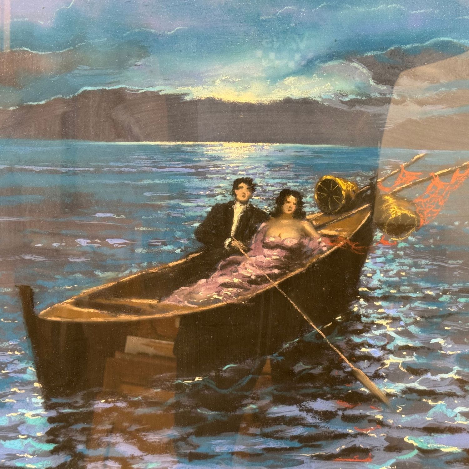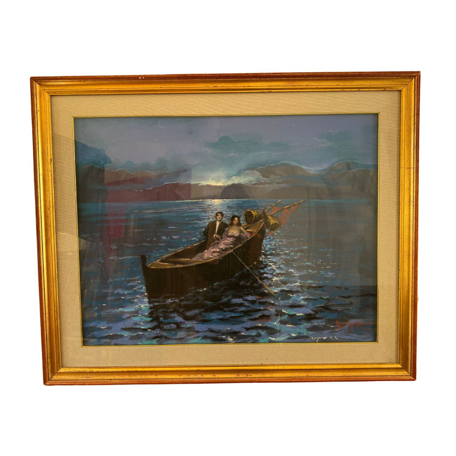 Dipinto olio su tavola, periodo XX secolo scuola italiana, raffigurante Scena galante sul mare.