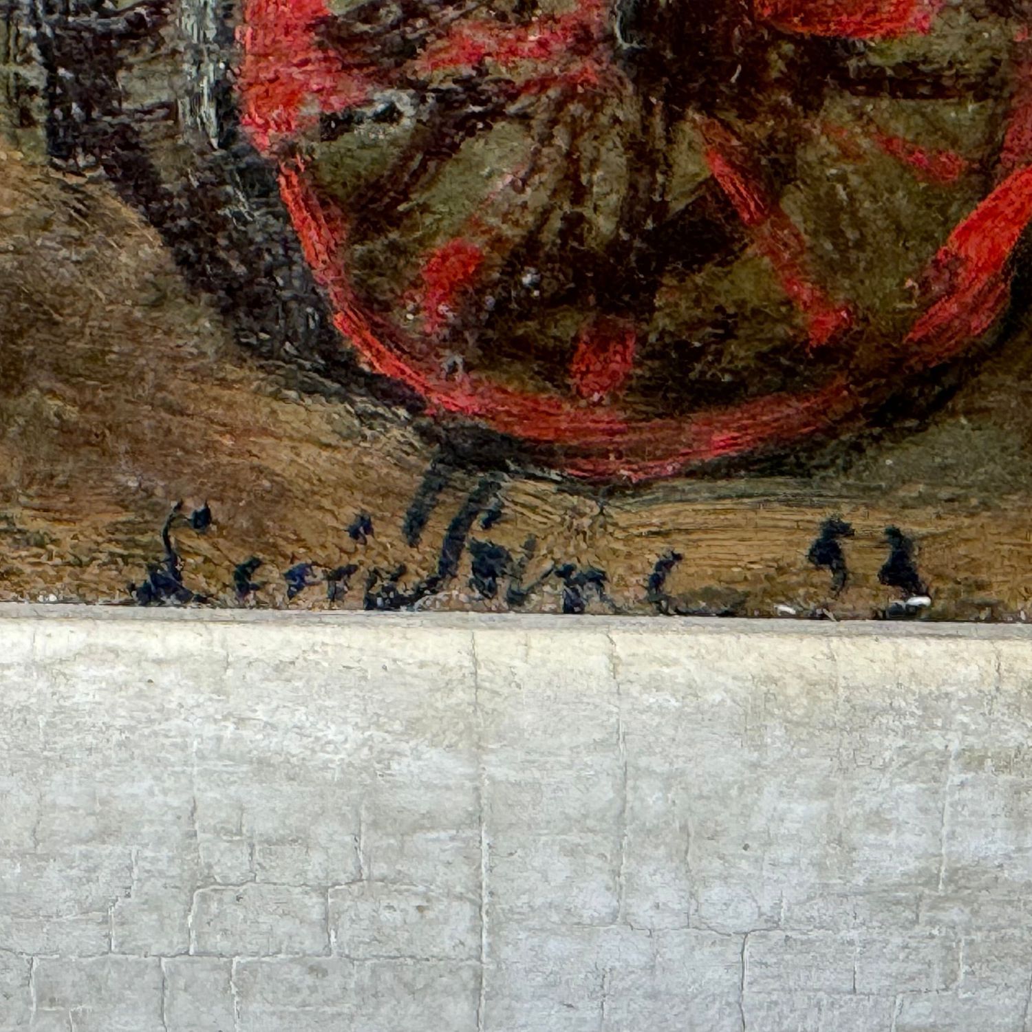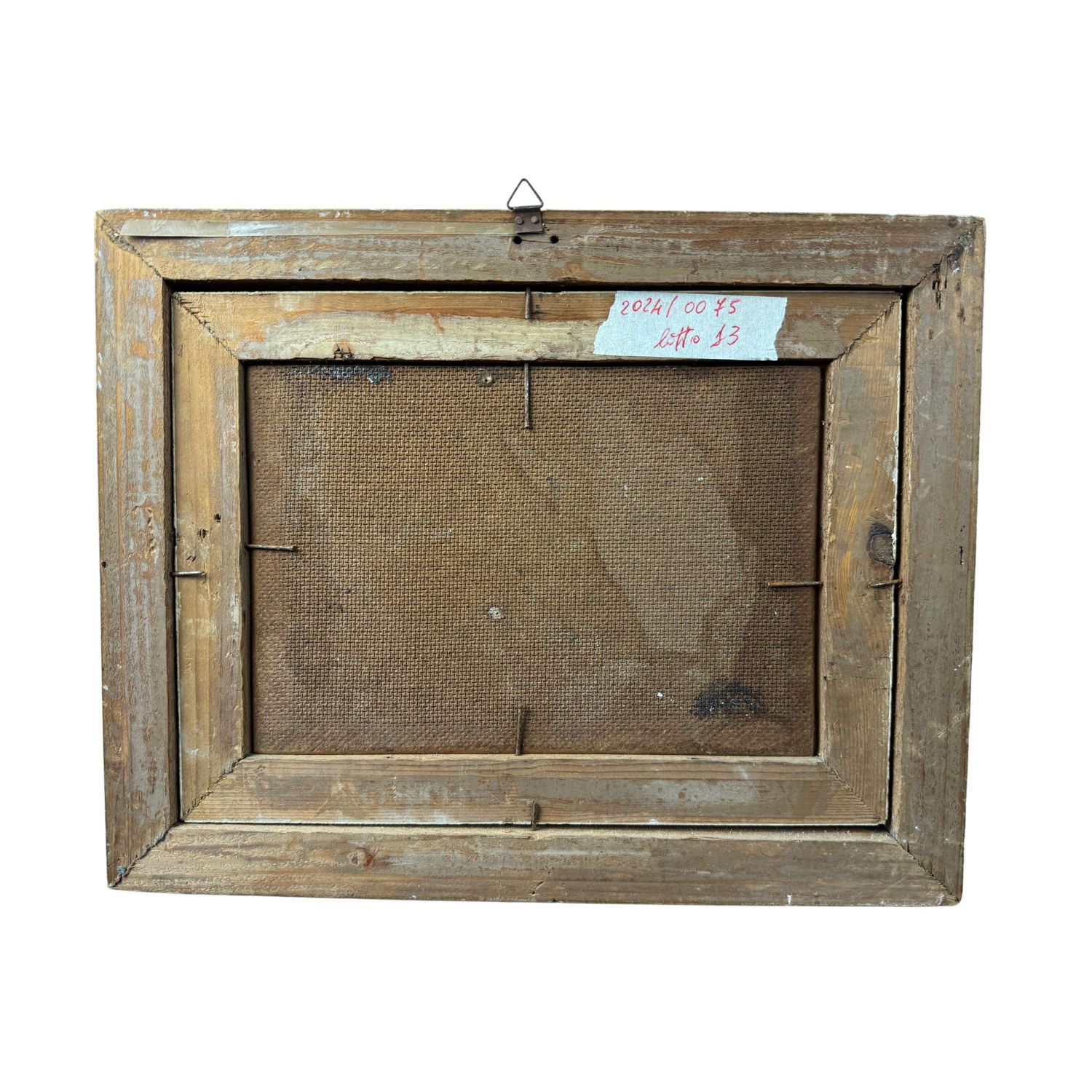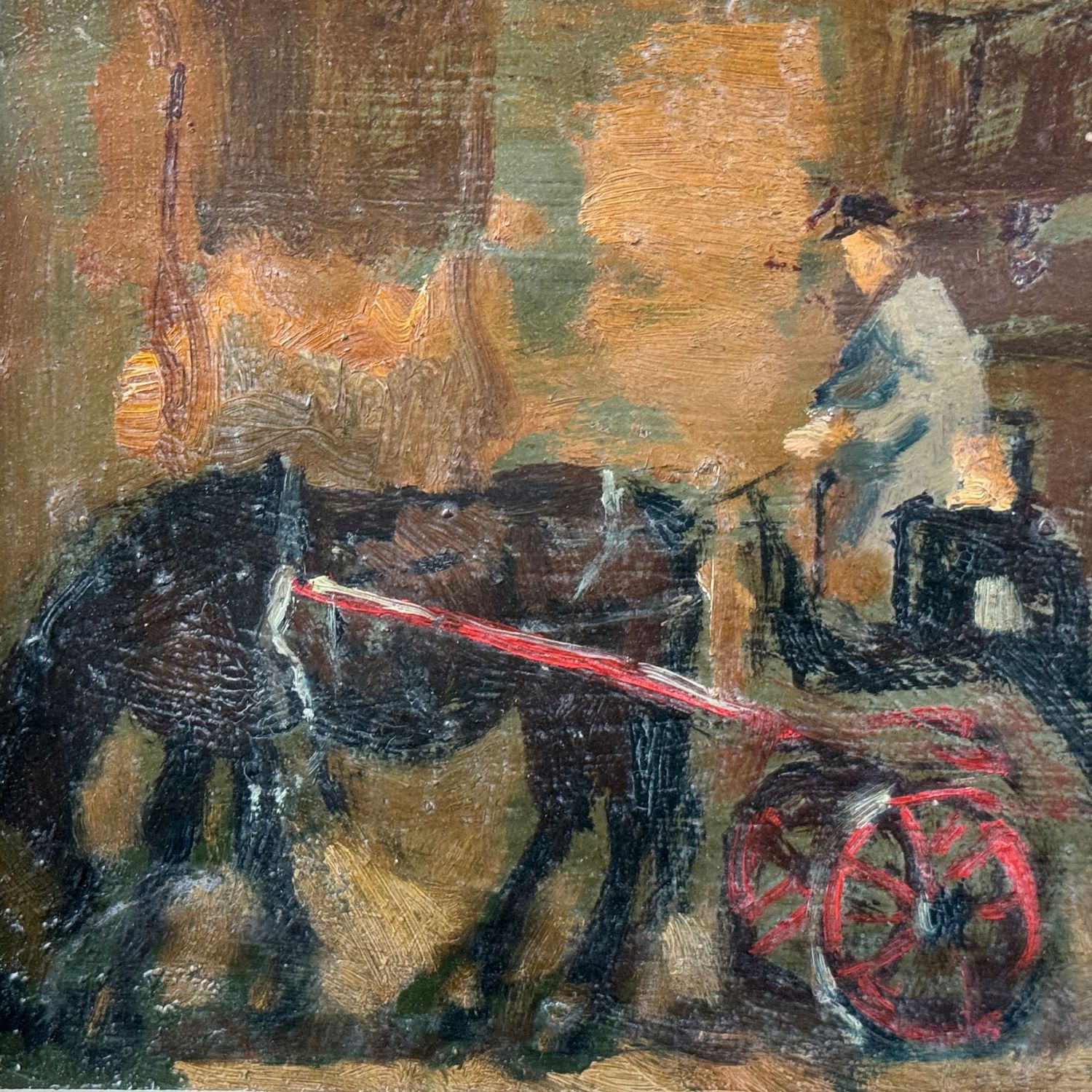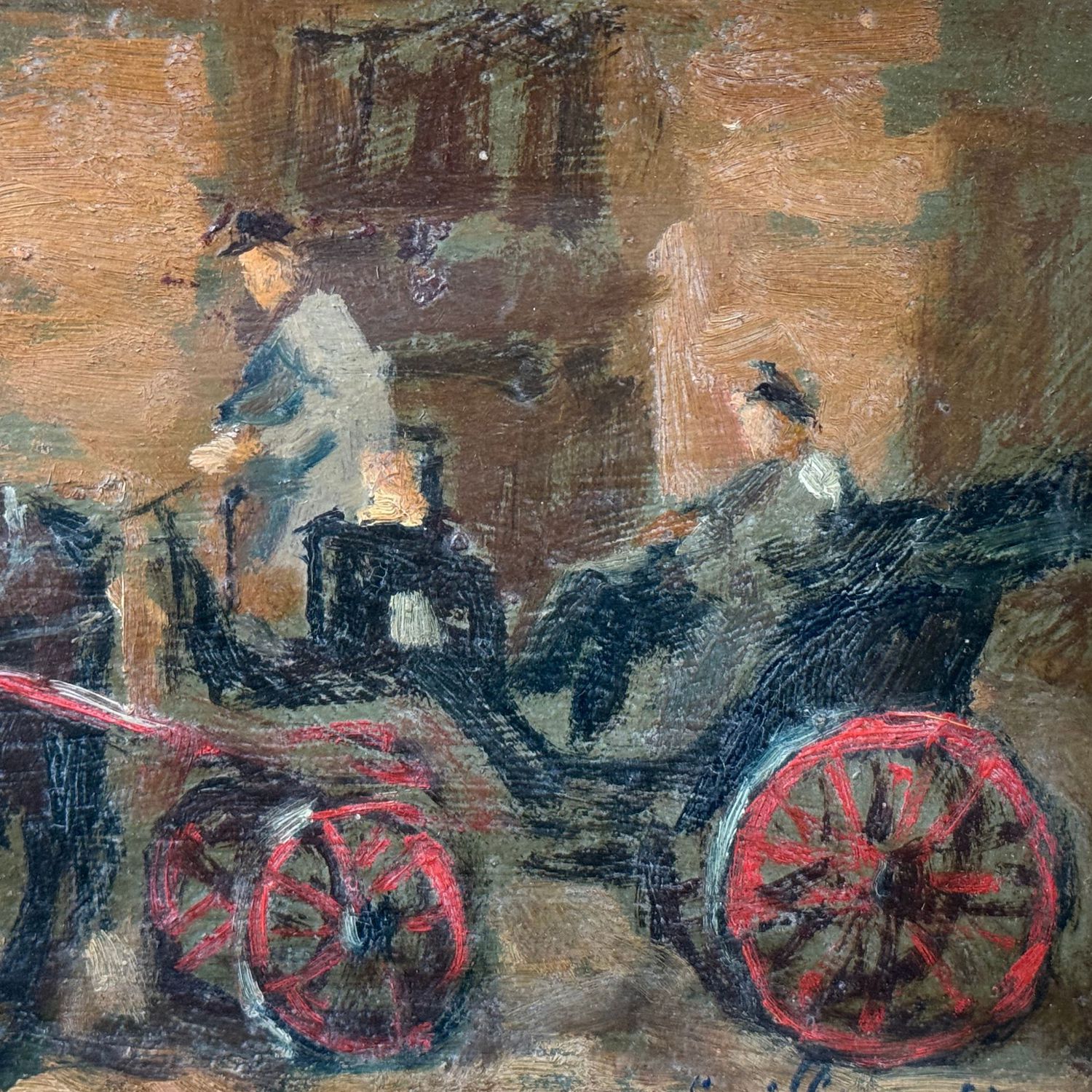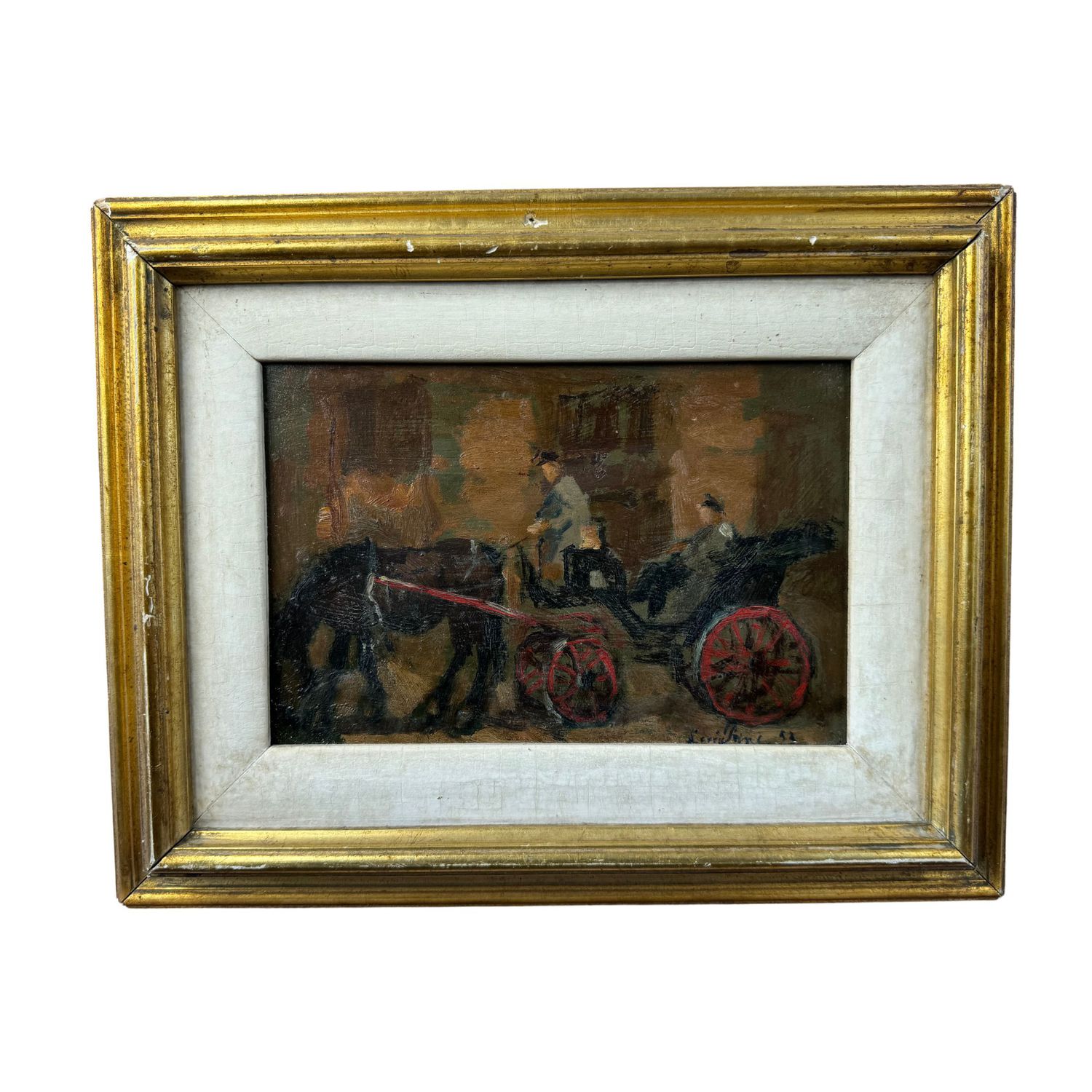 Dipinto olio su pannello, periodo XX secolo scuola Italiana, raffigurante Personaggi in carrozza.