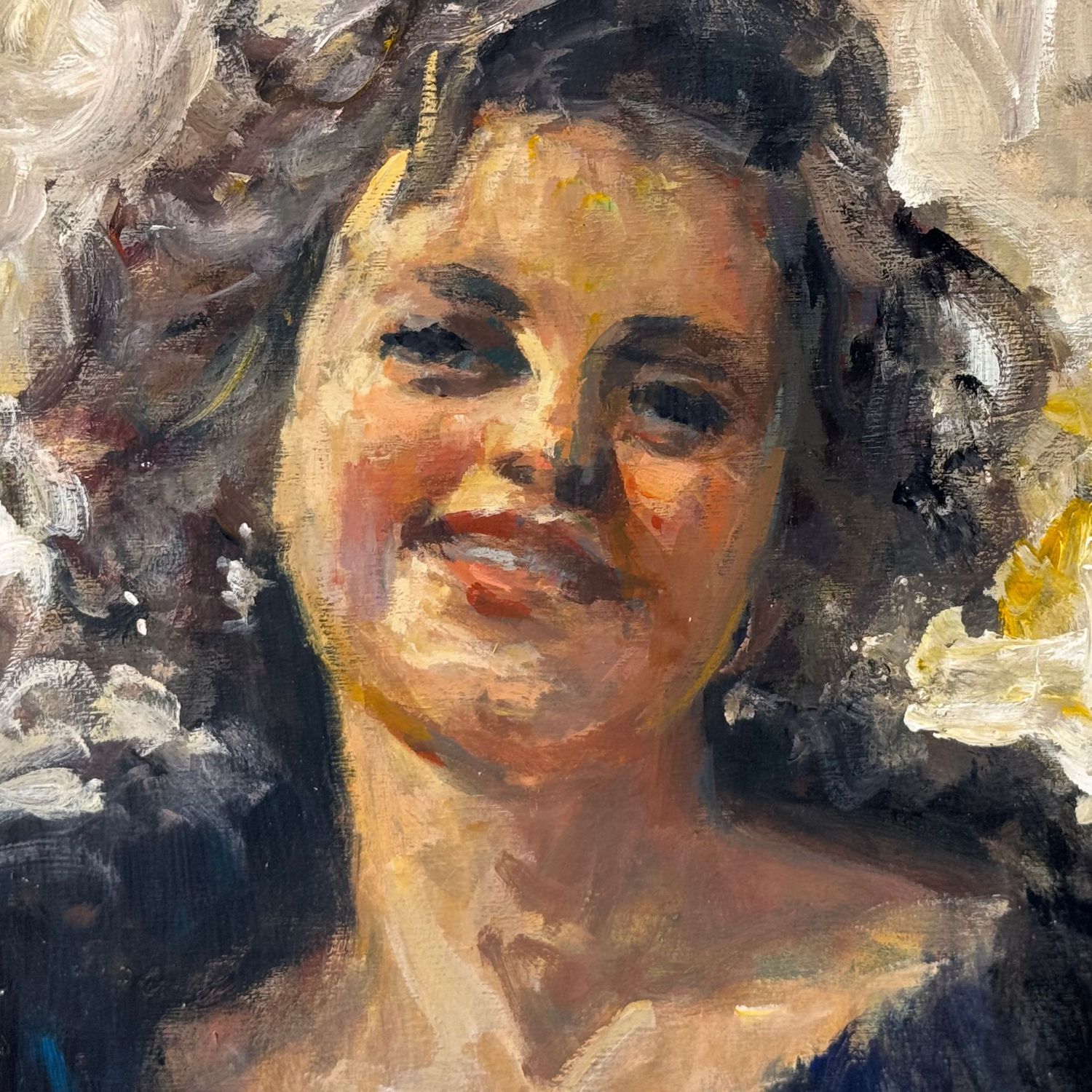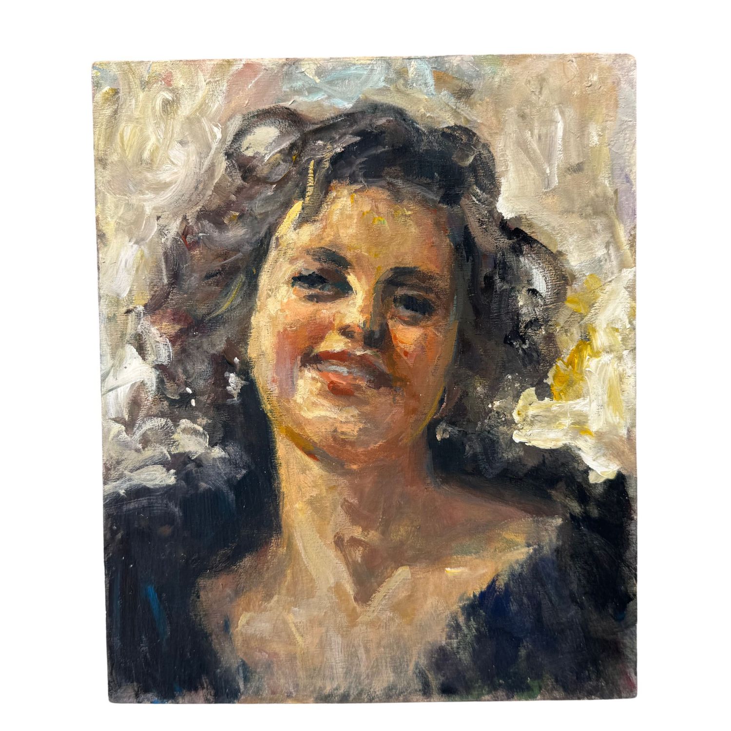 Dipinto olio su tavola, periodo XX secolo scuola Italiana, raffigurante Ritratto di giovane donna sorridente.