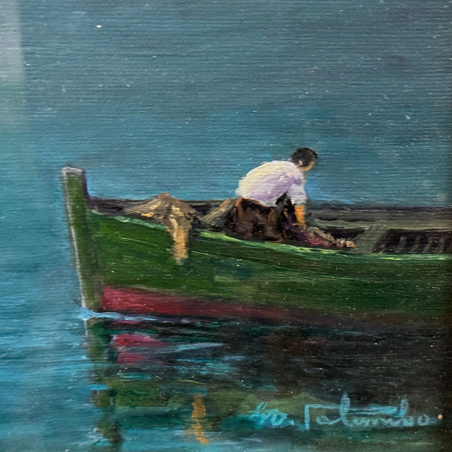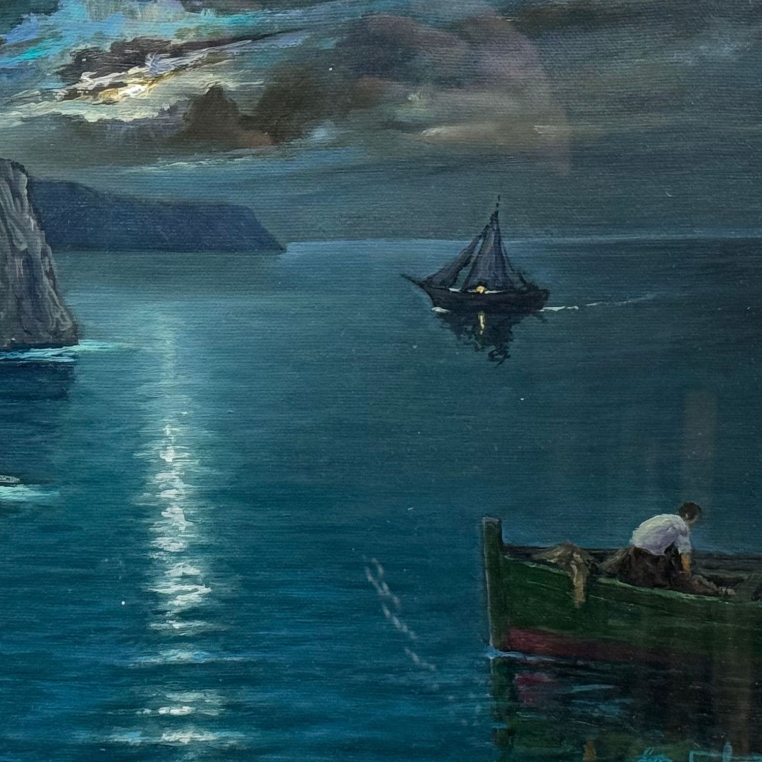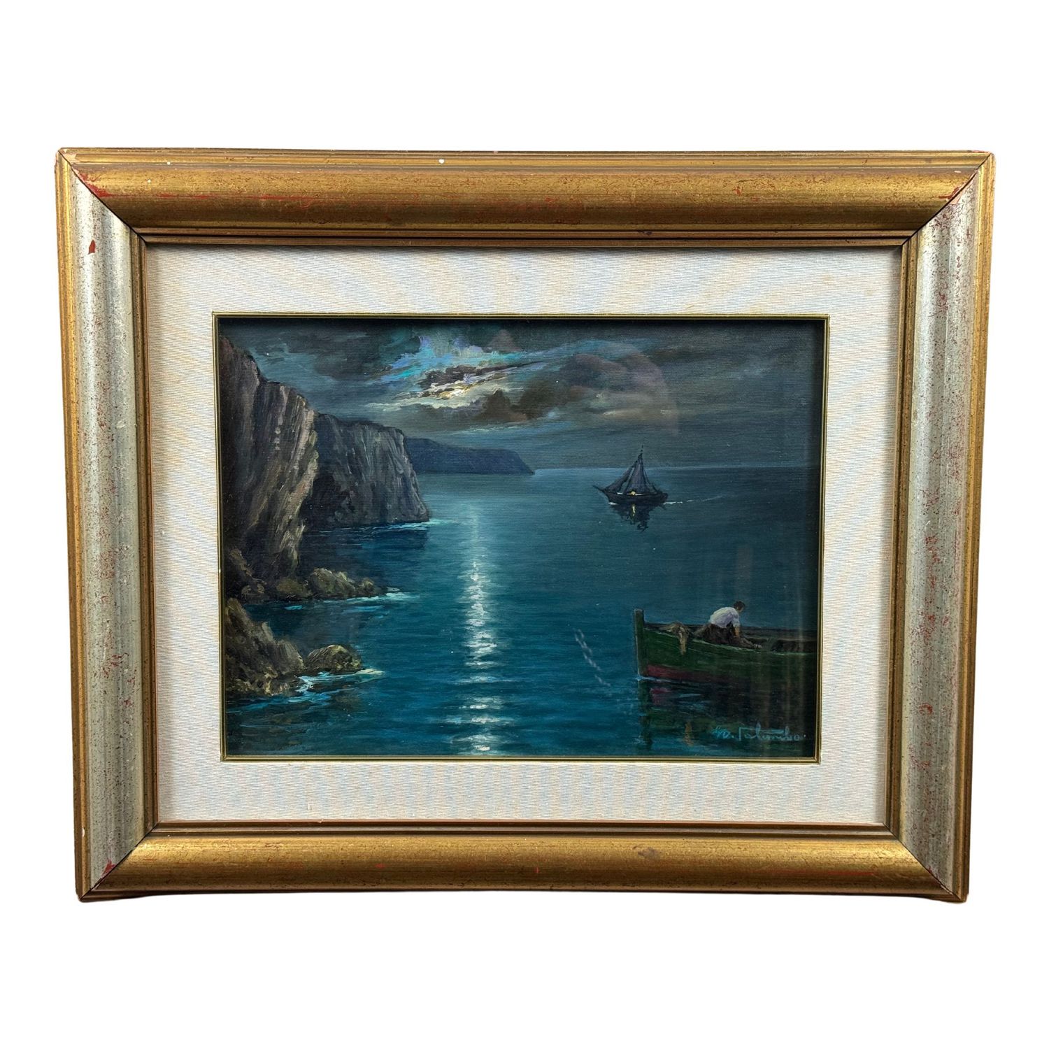 Dipinto olio su tela, periodo XX secolo scuola Italiana, raffigurante Scorcio di marina all'alba.