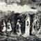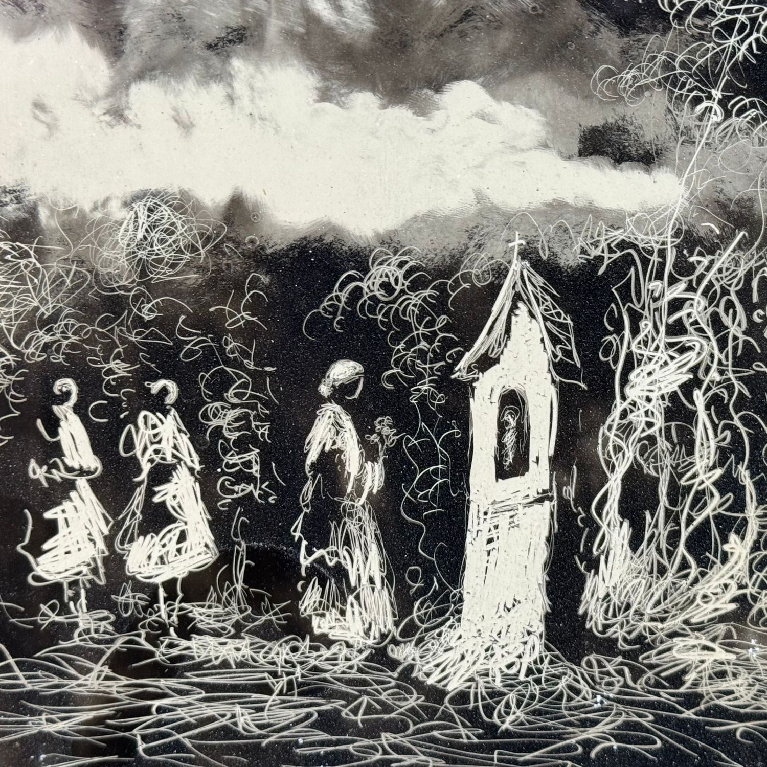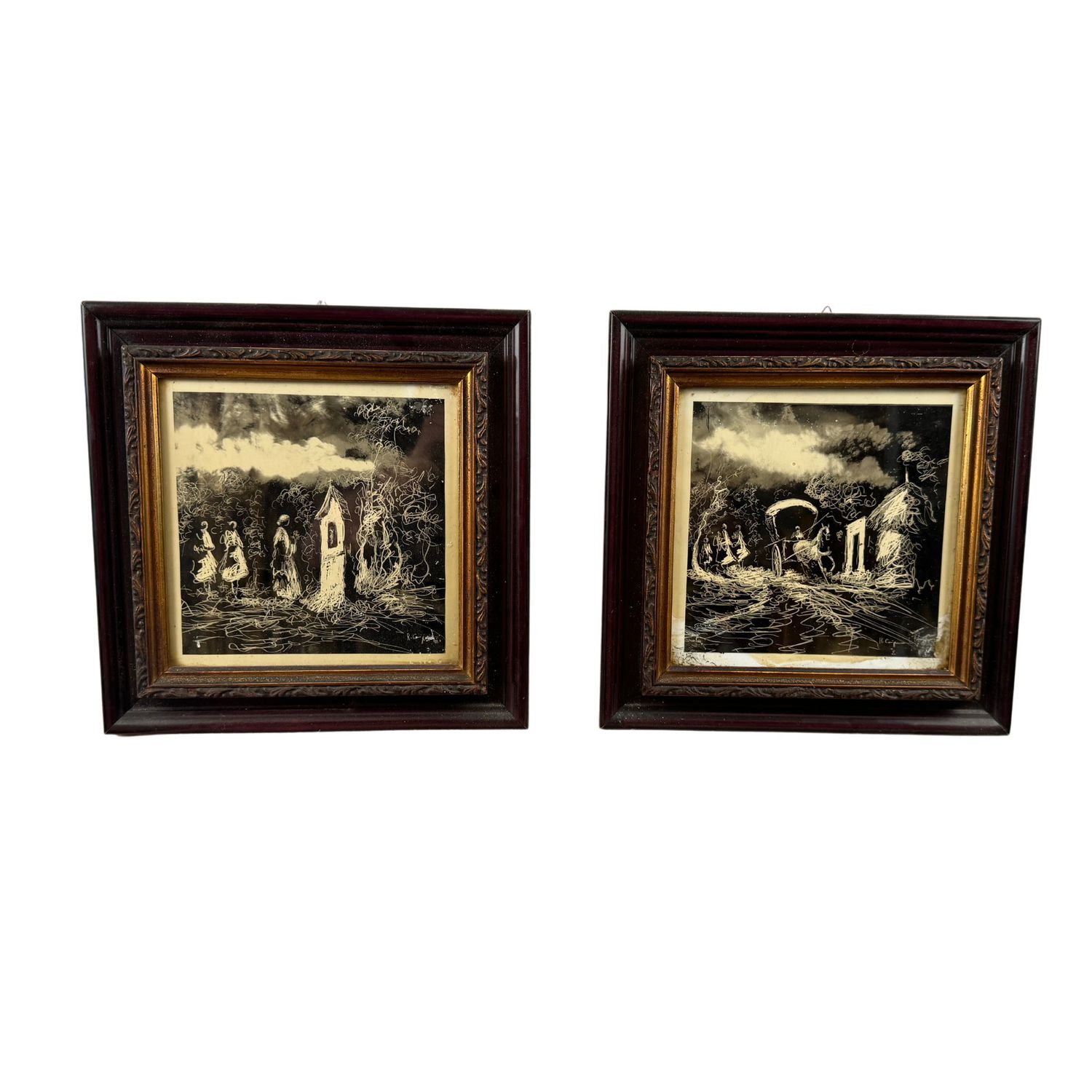Coppia di dipinti eseguiti con tecnica candela su mattonella, periodo XXI secolo scuola Italiana, raffiguranti Paesaggio con personaggi.