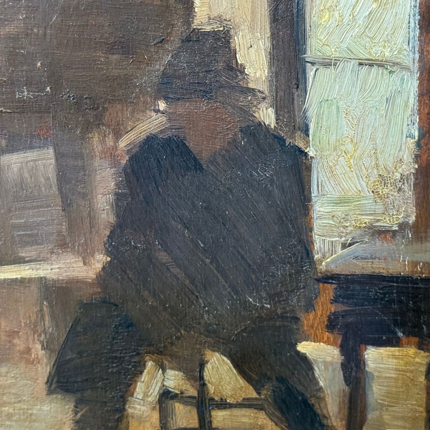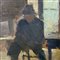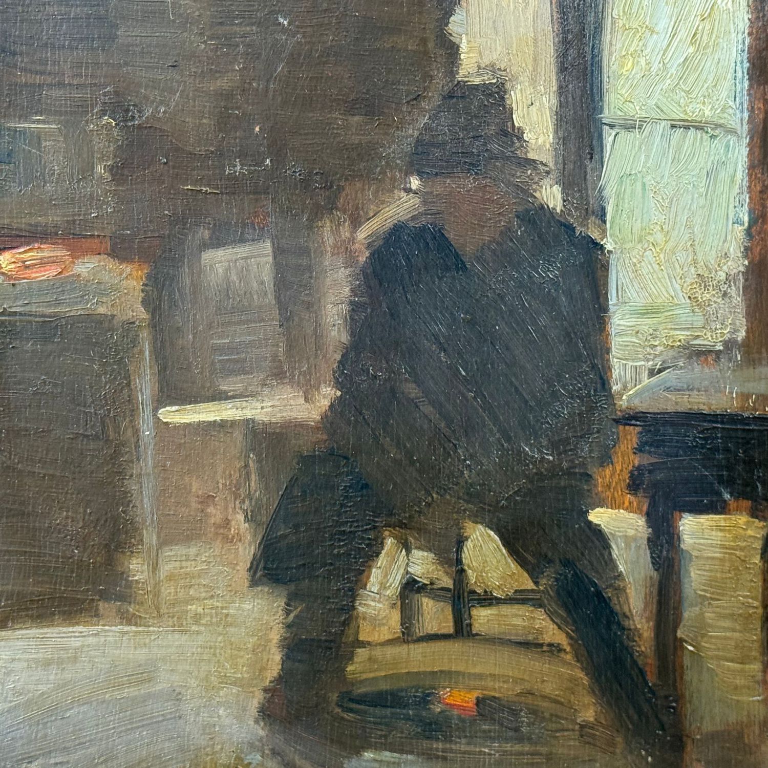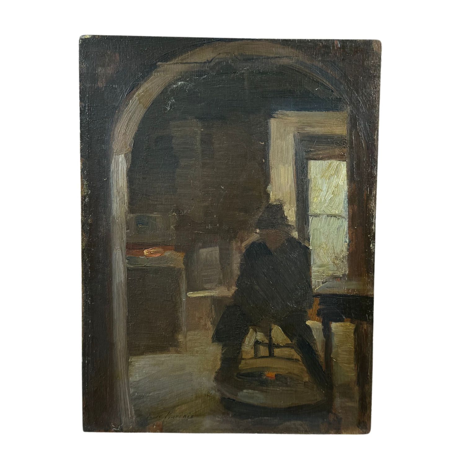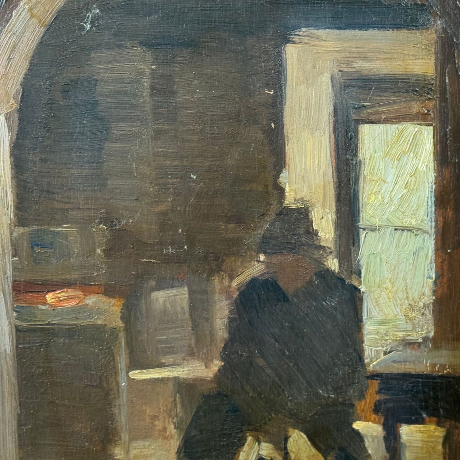 Dipinto olio su tavola, periodo XX secolo scuola Italiana, raffigurante Ritratto di un uomo in un interno nella maniera impressionista.