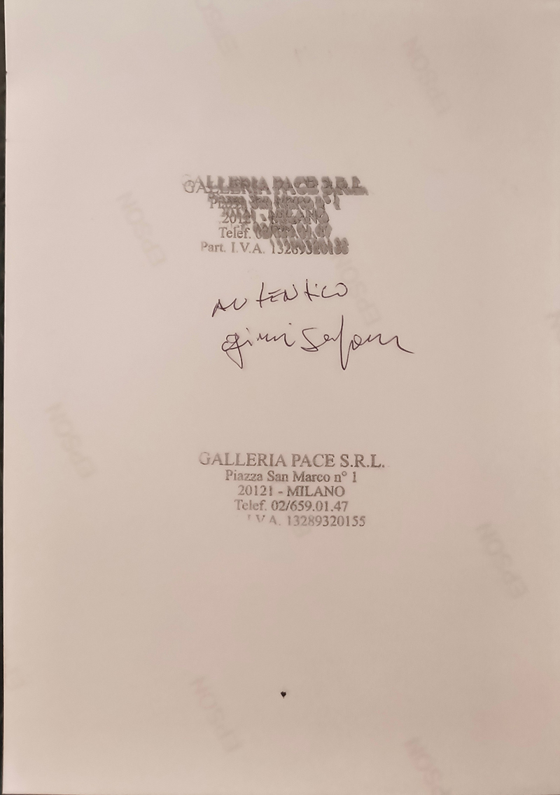 Certificazione: Firmato e titolato retro opera - Autentica su foto a cura di Galleria Pace