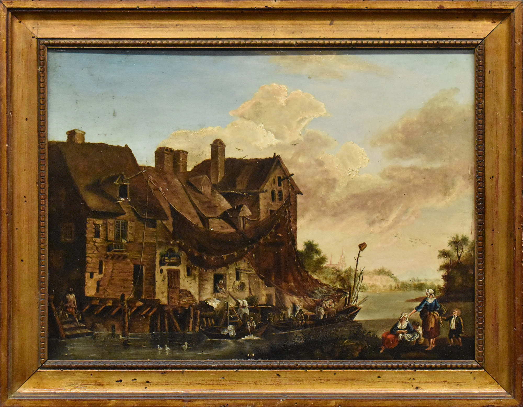 'Paesaggio fluviale con personaggi e case' olio su tavola scuola fiamminga sec.XIX
