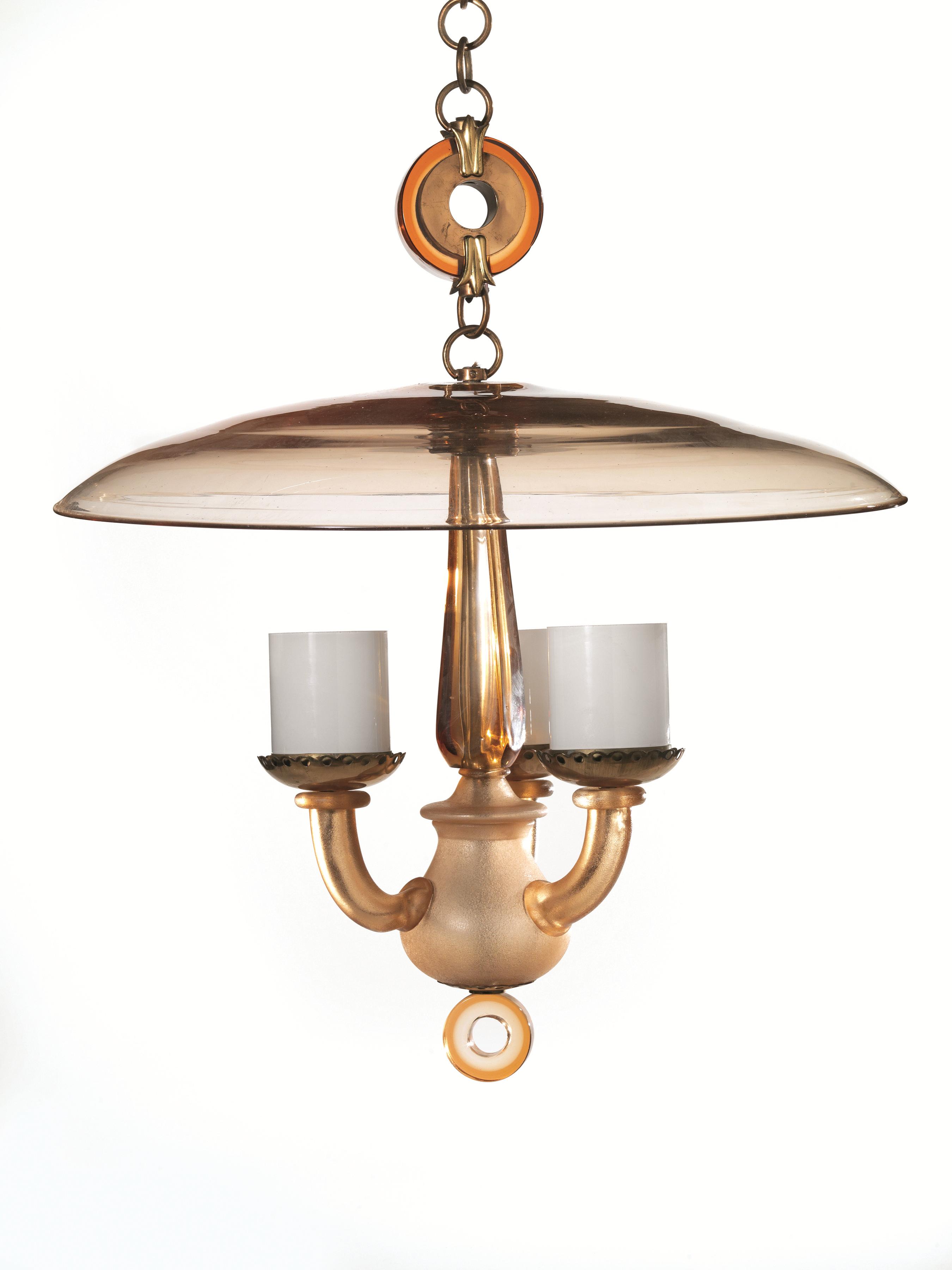 vetro soffiato e in parte acidato, tre bracci con luci sormontate da largo piatto convesso