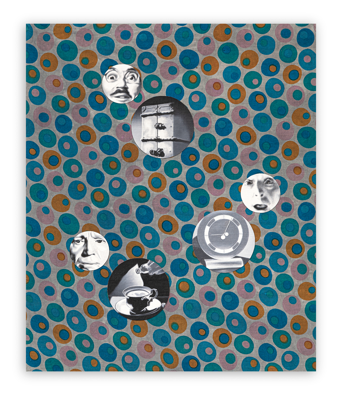 Collage di ritagli circolari di tela, dipinti ad olio, su tessuto