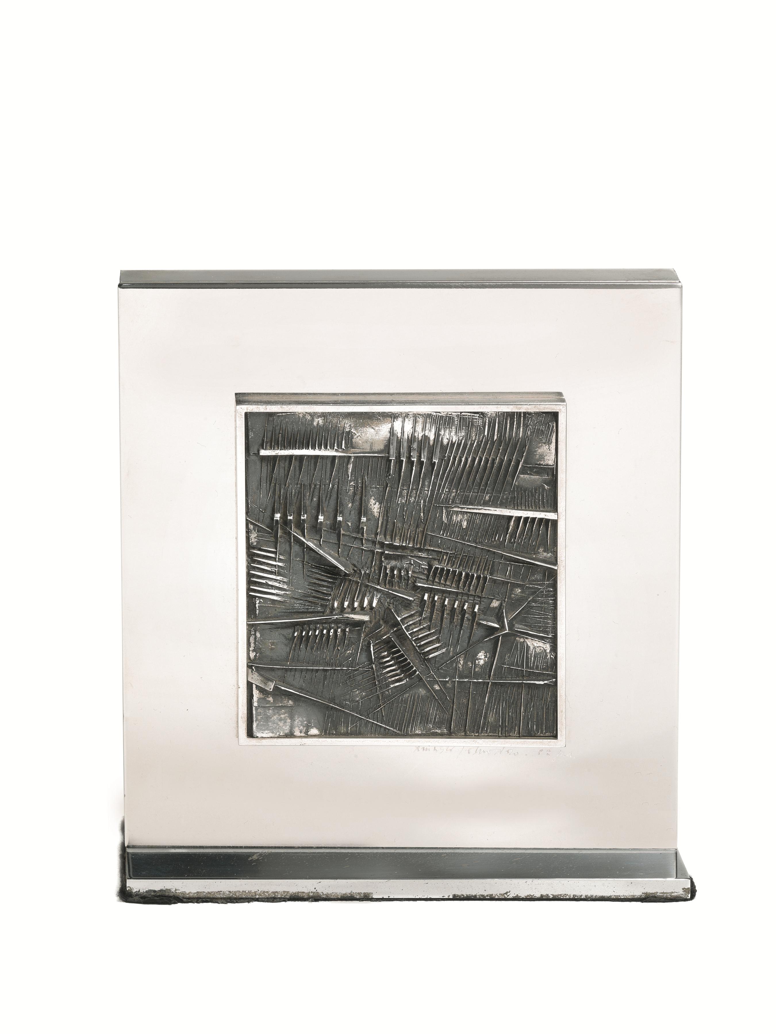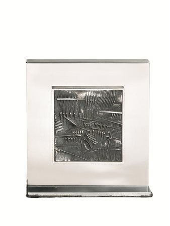argento e ottone cromato, cm 18,5x19,5x7, due esemplari più una prova d'artista; es. p.a.