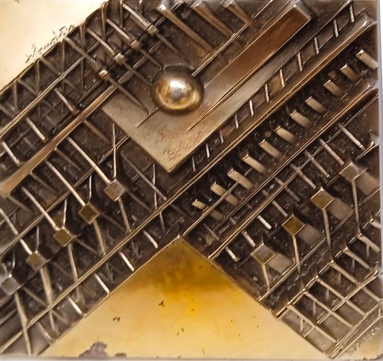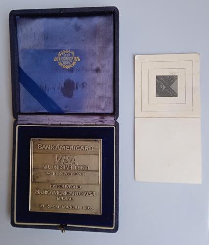 ARNALDO POMODORO (Morciano di Romagna 1926) Medaglia in metallo argentato. Cm 6,6x6,6. Reca firma in alto a sinistra A. Pomodoro. Coniata in un numero limitato di esemplari dallo Stabilimento Stefano Johnson S.p.A. Milano per Fiorio Colori S.p.A. Opera conservata nella sua custodia originale. Realizzata per il XIII Convegno di Bankamericard-Visa, Maggio 1982.