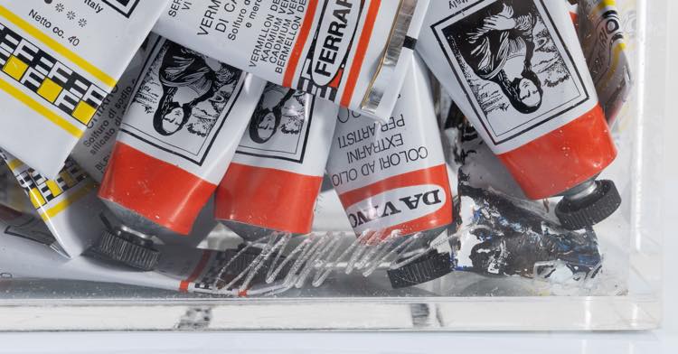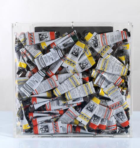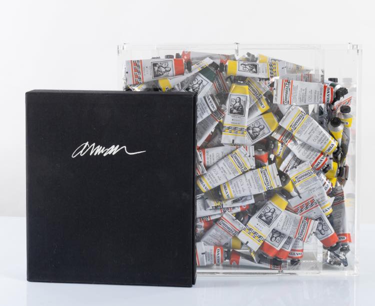 FERNANDEZ ARMAN (Nizza 1928 - New York 2005) "Accumulazione di tubetti". Tubetti e libro. Cm 38x36,5x17. Reca firma e numeri di tiratura in basso a destra Arman 80/80.