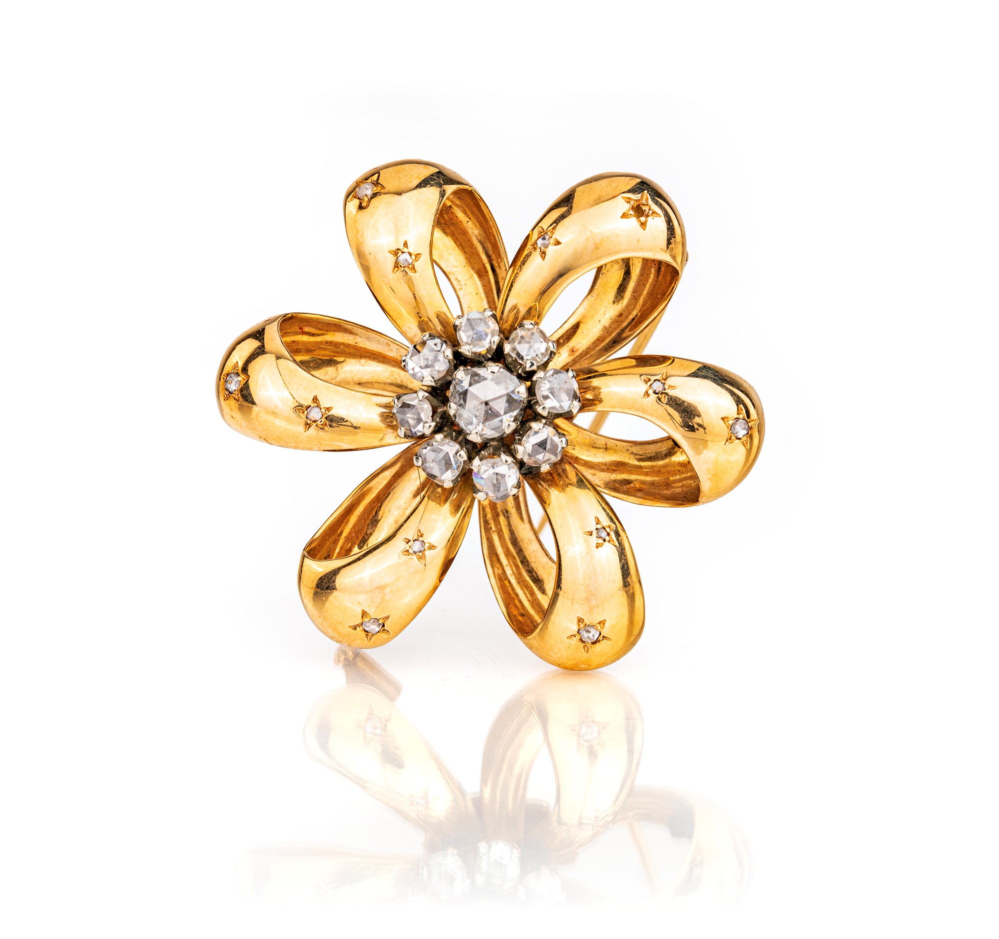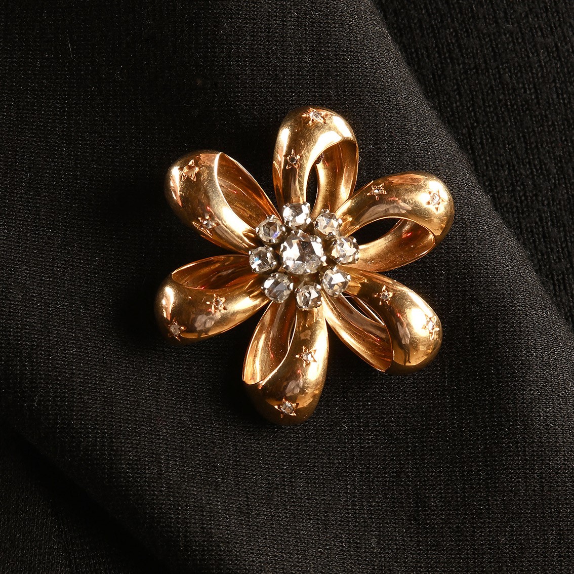 Spilla in oro e diamanti Oro giallo 750/000. Diamanti centrali in taglio rosa e vecchia Europa. Peso complessivo gr. 18,40. Anni '30/'40 Diametro cm 5