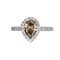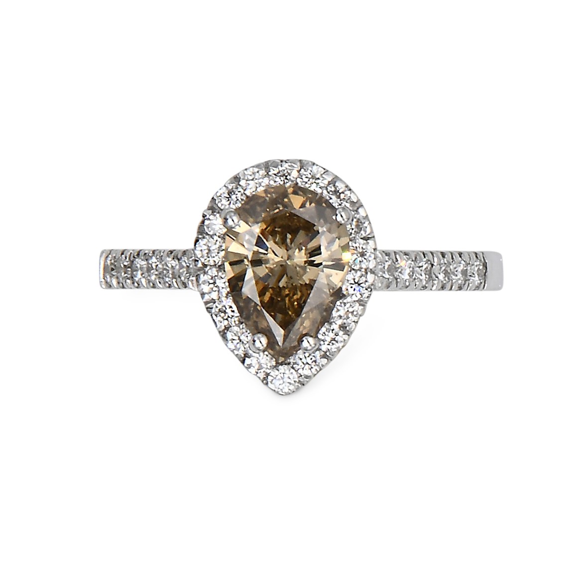 Anello in oro, diamante Fancy color e brillanti Oro bianco 750/000. Diamante Fancy color in taglio goccia ct. 1 ca. Diamanti in taglio rotondo brillante ct. 0,35 ca. Peso complessivo gr. 3,30. Misura 12
