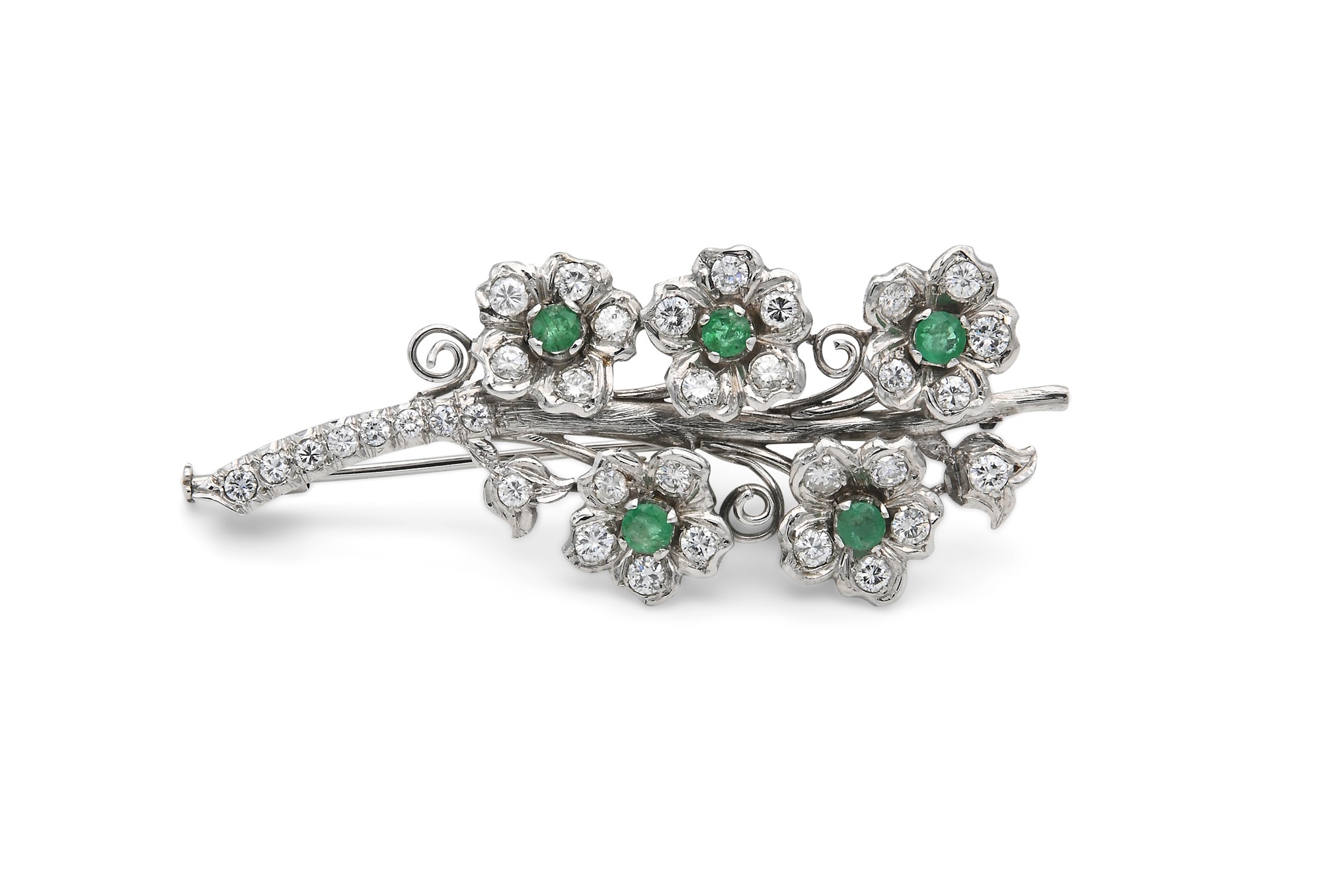 Spilla in oro, brillanti e smeraldi Oro bianco 750/000. Diamanti in taglio rotondo brillante ct. 1,20 ca, prob G-H, VS. Peso complessivo gr. 9,80. cm 6 x 2