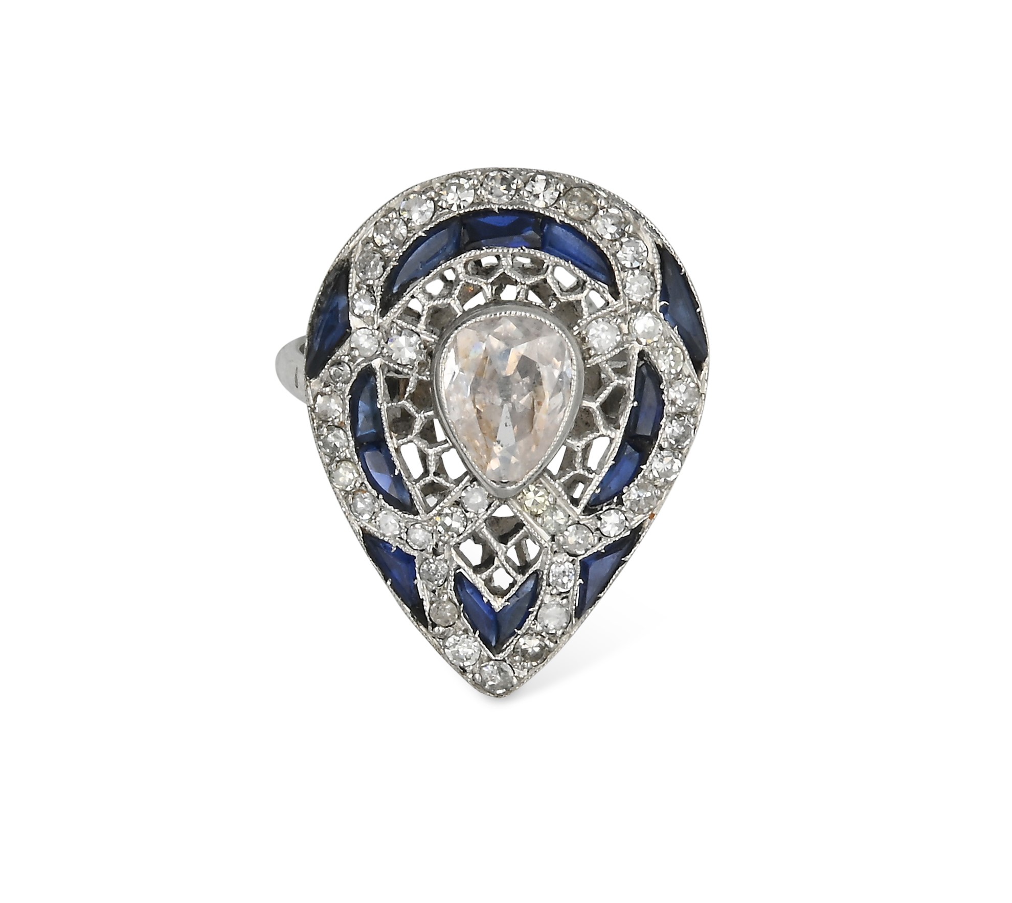 Anello decò a goccia in platino, diamanti e zaffiri Platino 950/000. Diamanti...