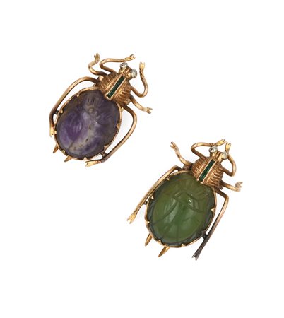 Coppia di spille scarabeo in oro, ametista e giada Oro giallo 750/000. Peso...