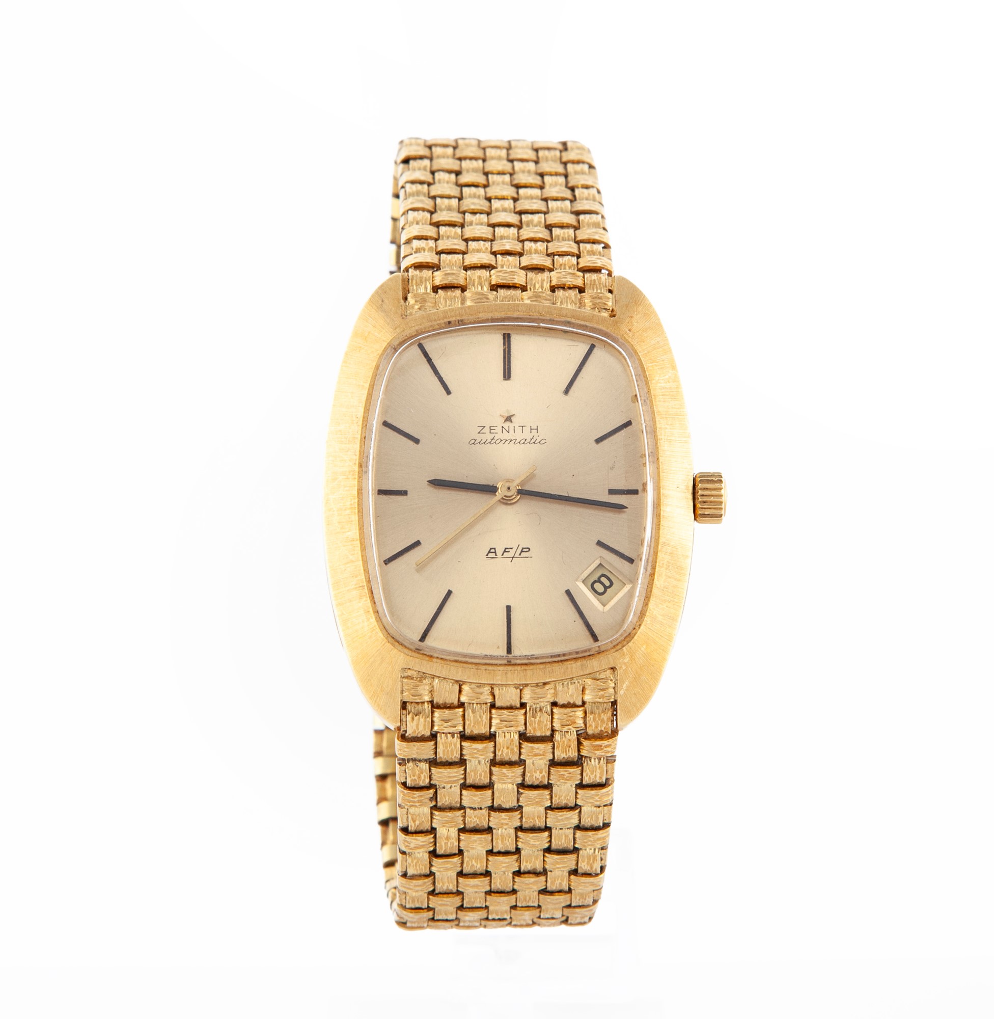 Zenith, orologio polso in oro Oro giallo 750/000. Cassa n° 935045. Bracciale originale a maglie in oro 750/000. Quadrante dorato, indici applicati, data, lancette a bastone, secondi al cento. Movimento a carica automatica, bilanciere monometalico, spirale piana. Peso complessivo gr. 80,3 Anni '70 mm. 31 x 38. Lunghezza cm 18