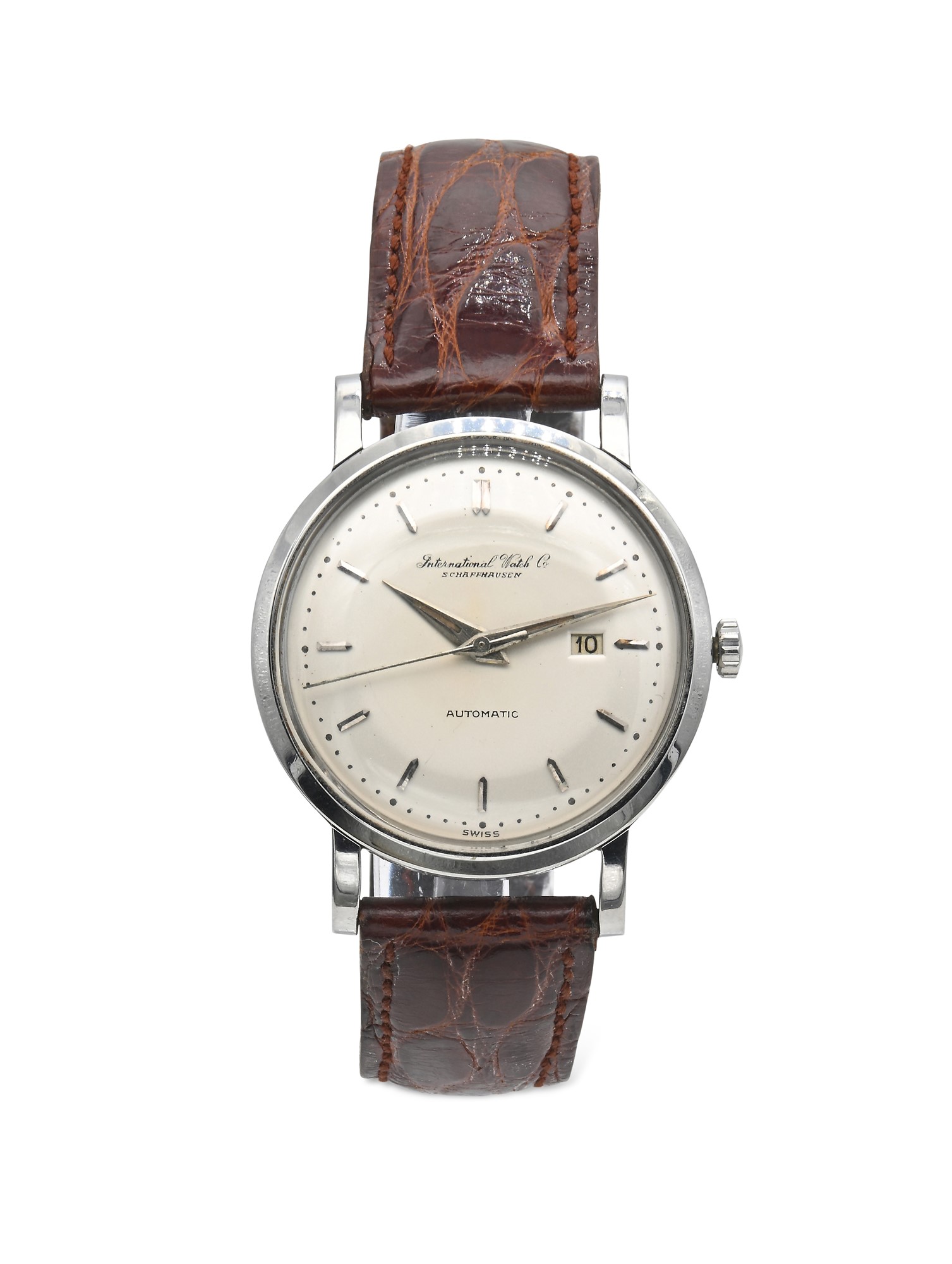 International Watch orologio in acciaio Acciaio. Cassa staybrite n° 1379416, fondello a scatto. Quadrante argentato, indici applicati, data, secondi al centro. Movimento automatico, n° 1358991, 21 rubini, bilanciere monometalico con viti, spirale Breguet. Diametro mm 35