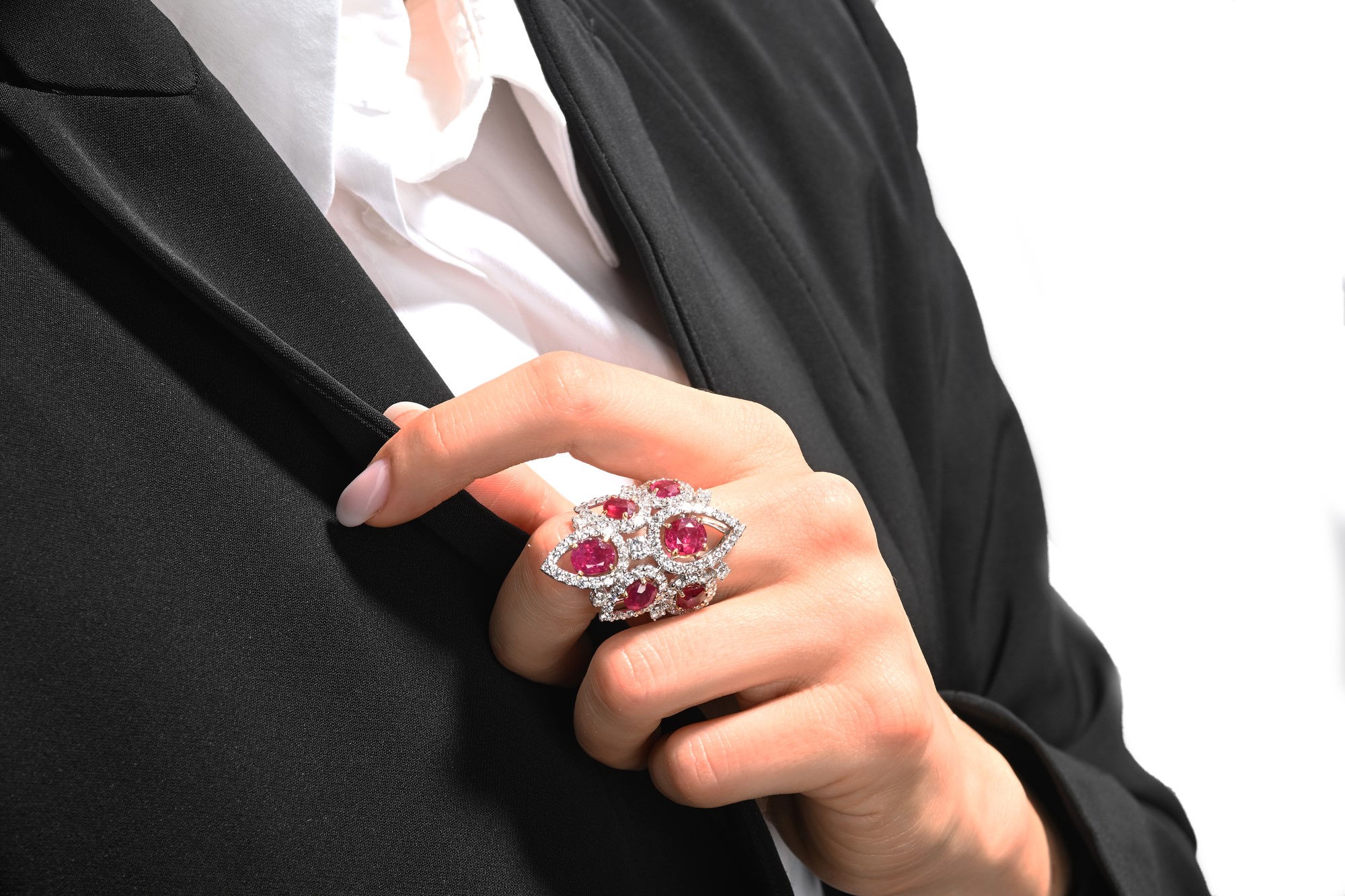 Repossi, anello in oro brillanti e rubini Oro bianco 750/000. Diamanti i taglio rotondo brillante ct. 3,25, F-G, IF-VVS. Rubini naturali in taglio ovale ct. 7,41, Myanmar (Birmania), SENZA INDICAZIONE DI TRATTAMENTO TERMICO. Corredati di certificazioni gemmologiche Gubelin, n° 18100154, n° 18100164, n° 18100187, n° 18100188, n°18100189, n°18100186. Misura 15