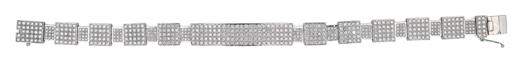 Bracciale in oro e brillanti Oro bianco 750/000. Diamanti in taglio rotondo brillante ct. 5,70, F, VS. Peso complessivo gr. 37,80. Corredato di certificazione gemmologica. Lunghezza cm 20