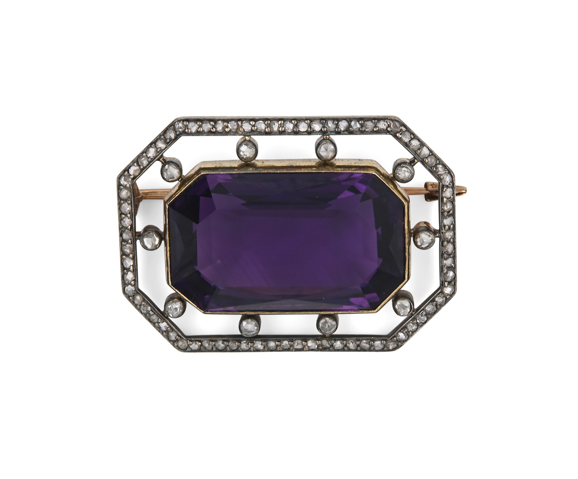 Spilla antica in oro, argento, ametista e diamanti Peso complessivo gr 27,90 cm 5x3,5