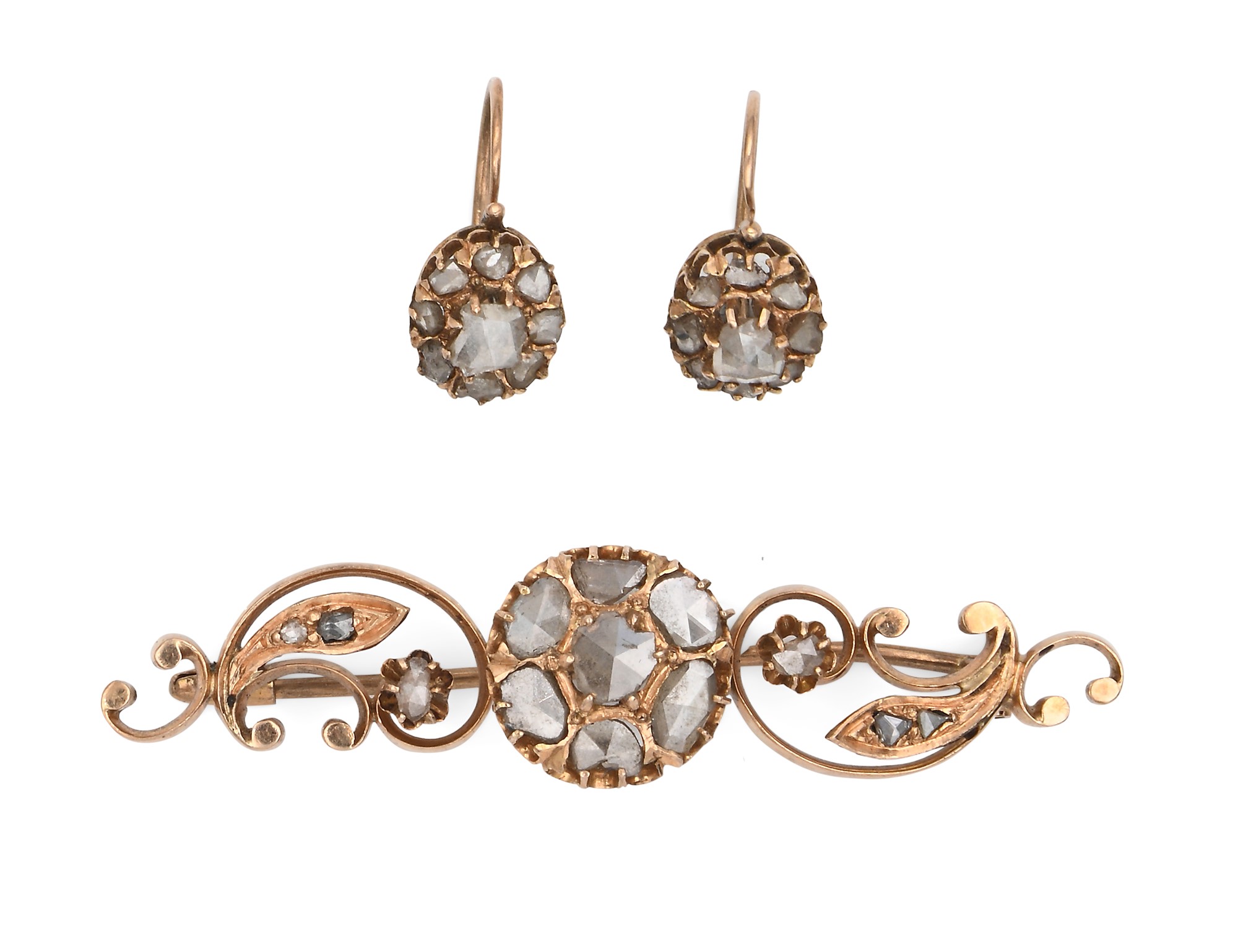 Parure antica spilla e coppia di orecchini in oro e diamanti Oro a basso titolo e diamanti in taglio rosa. Peso complessivo gr 8,80