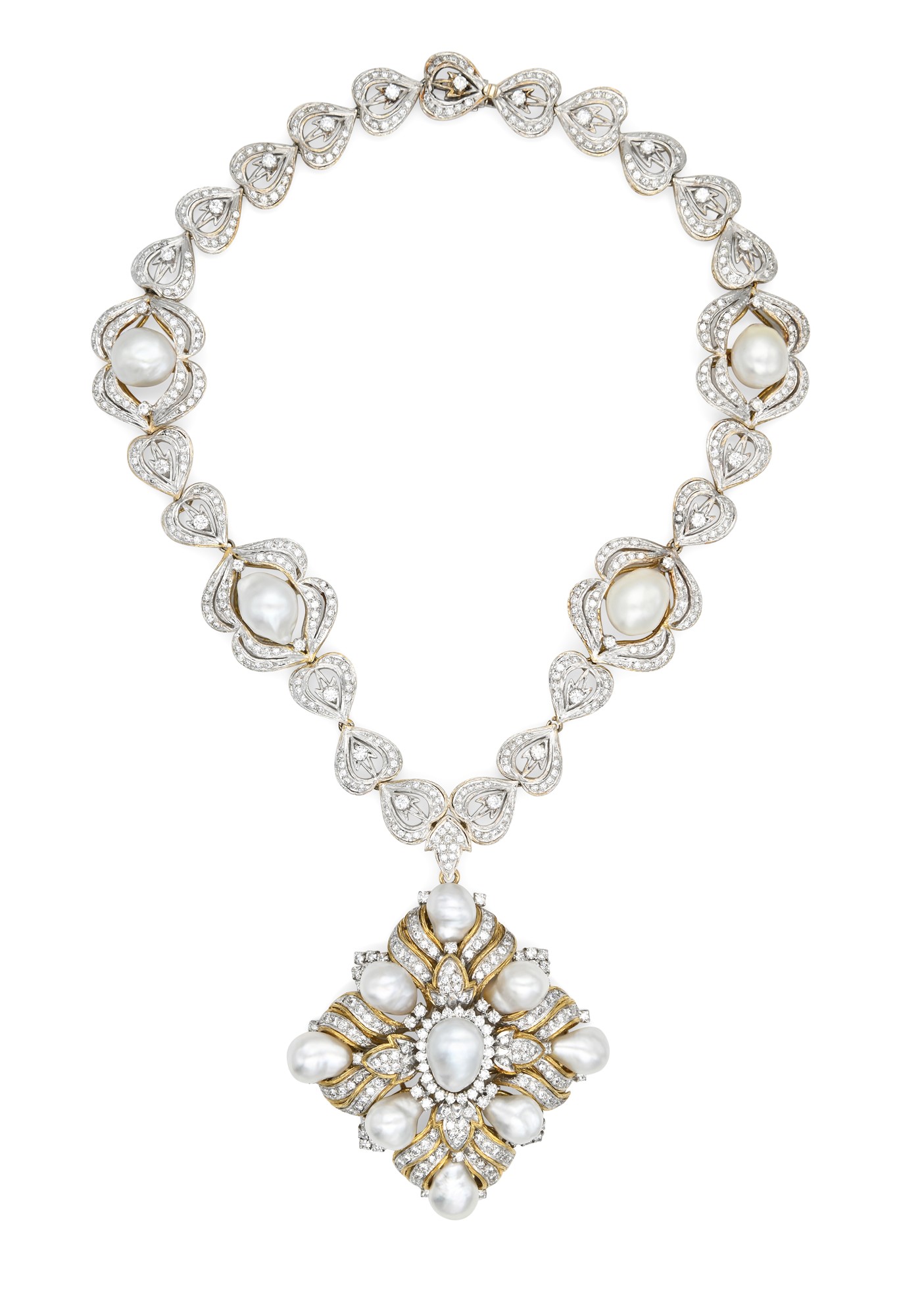 Collana con pendente spilla in oro, brillanti e perle Oro bianco e giallo 750/000 la collana e 585/000 il pendente. Perle barocche South Sea mm 11/13, diamanti in taglio rotondo brillante ct. 11ca F-G, VVS-VS. Peso complessivo gr. 158 Lunghezza cm 45, pendente 7 x 6