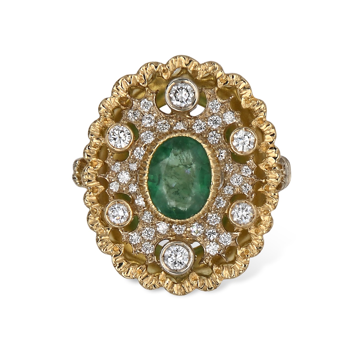 Mario Buccellati, anello in oro, brillanti e smeraldo Oro giallo 750/000. Smeraldo centrale in taglio ovale, diamanti in taglio rotondo brillante. Peso complessivo gr. 10,40.