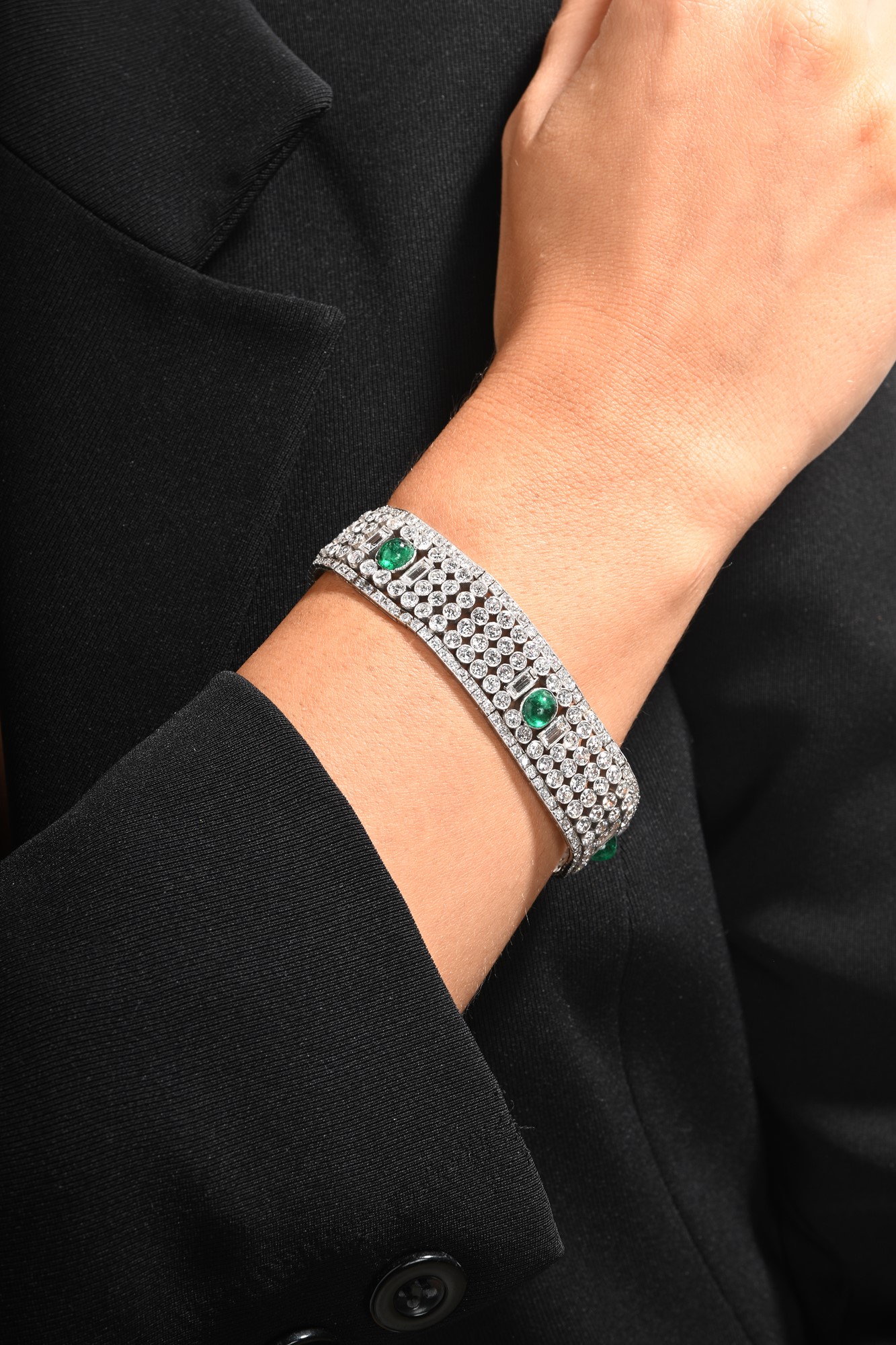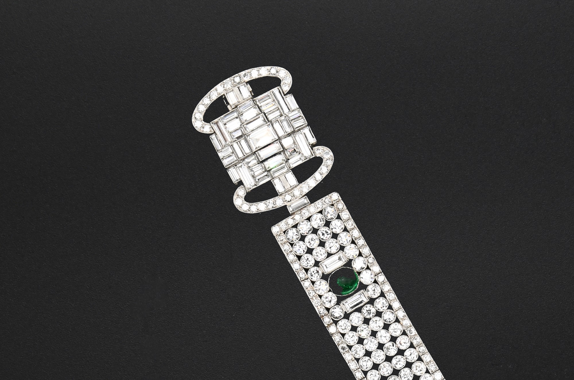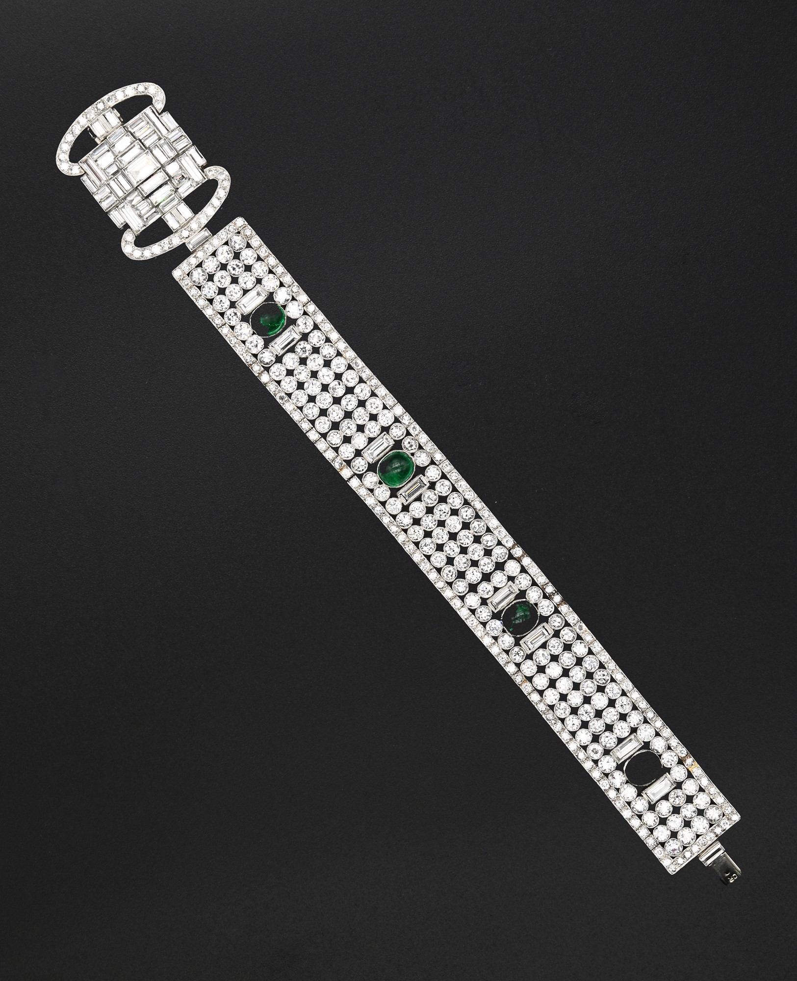 Bracciale decò in oro, platino, diamanti e smeraldi Oro e platino. Diamanti in taglio rotondo e tagli baguettes ct. 22ca, prob F-G, VVS-VS. Smeraldi naturali in taglio cabochon ct. 5 ca. Peso complessivo gr. 62,40