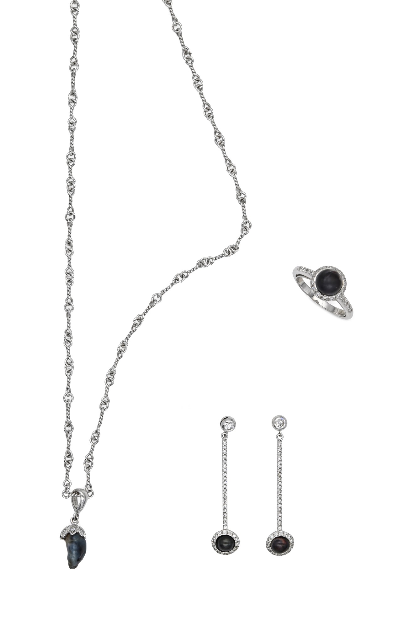 Parure di pendente, anello e coppia di orecchini in oro, brillanti e perle naturali spontanee Oro bianco 750/000. Perle naturali spontanee ct. 7,31. Diamanti in tagli rotondo brillante ct. 1,75, F-G, IF- VVS. Peso complessivo gr 18,10. Corredato di certificazione gemmologica IGI n° 19207 Lunghezza collana cm 40; orecchini lunghezza cm 5; anello misura 13