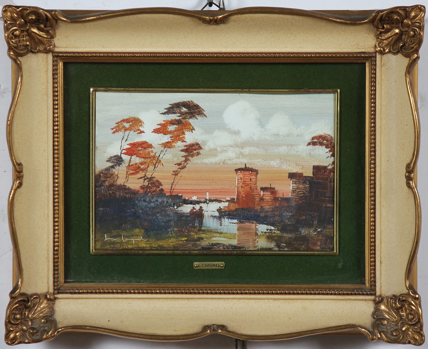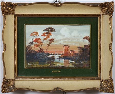 ANONIMO Paesaggio. Olio su lamiera. Cm 12,00 x 18,00. Firmato Lucio Carcinel. Cornice in lacca e profili dorati.