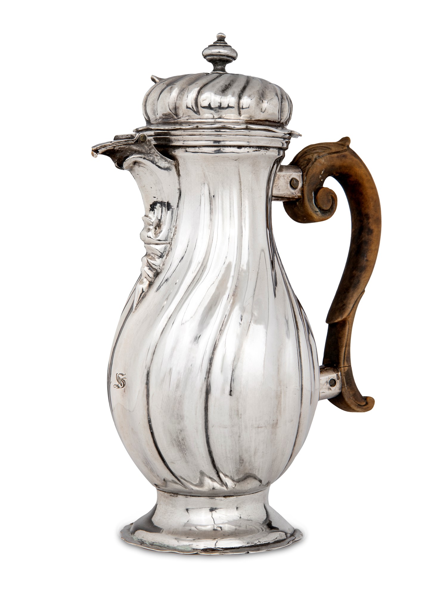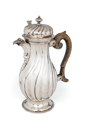 Caffettiera in argento, Germania, città di Augsburg 1767 - 1769, orafo Jakob Wilhelm Kolb corpo piriforme con superficie a torchon e piede circolare; versatoio a mensola con chiusura incernierata; coperchio a cupolino con pomolo a trottola; manico sagomato in legno altezza cm 19 - gr. 295