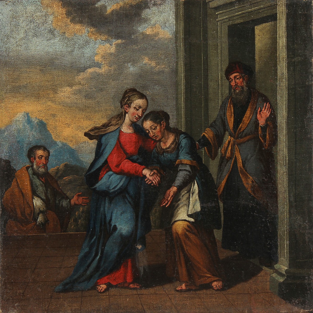 ARTISTA VENETO DEL XVII SECOLO L'incontro di Marta e Maria. Olio su tela . Cm 39,50 x 39,50.