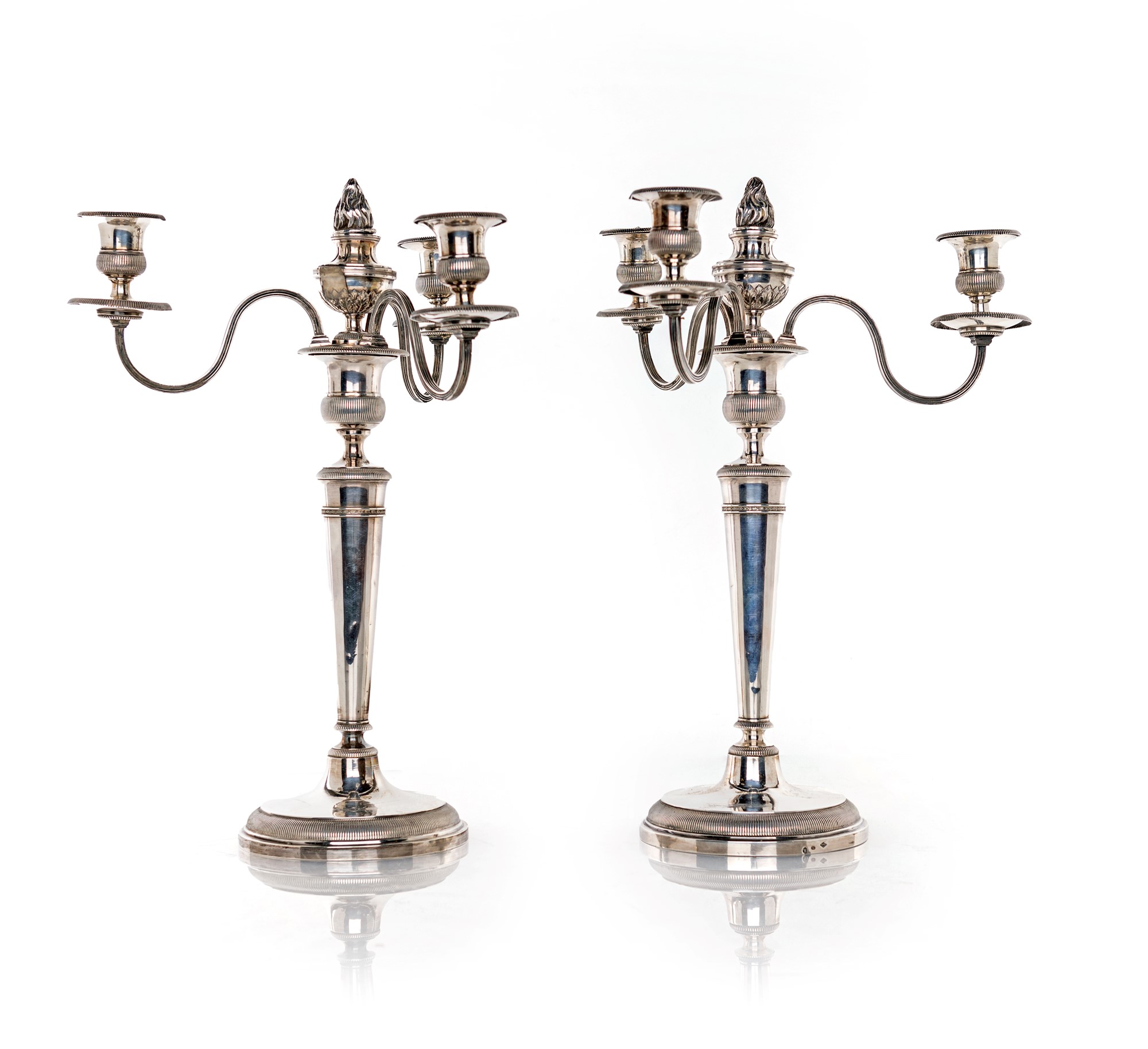 Coppia di candelabri in argento a quattro luci, Torino, XIX secolo fusto rastremato su piede circolare, sormontato da vaso a cratere da cui si dipartono tre braccetti incurvati con reggicandela a forma di vaso Medici; quello centrale con chiusura a fiammella altezza cm 44 - peso complessivo gr. 2950