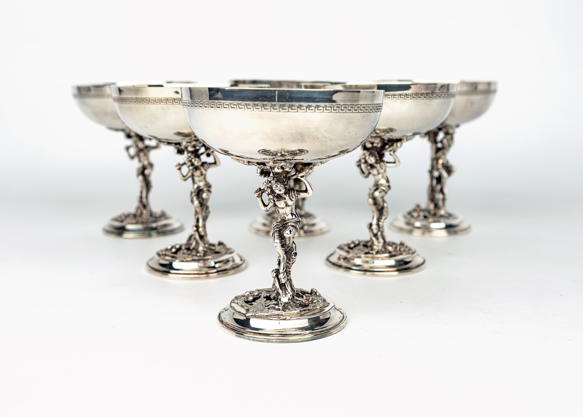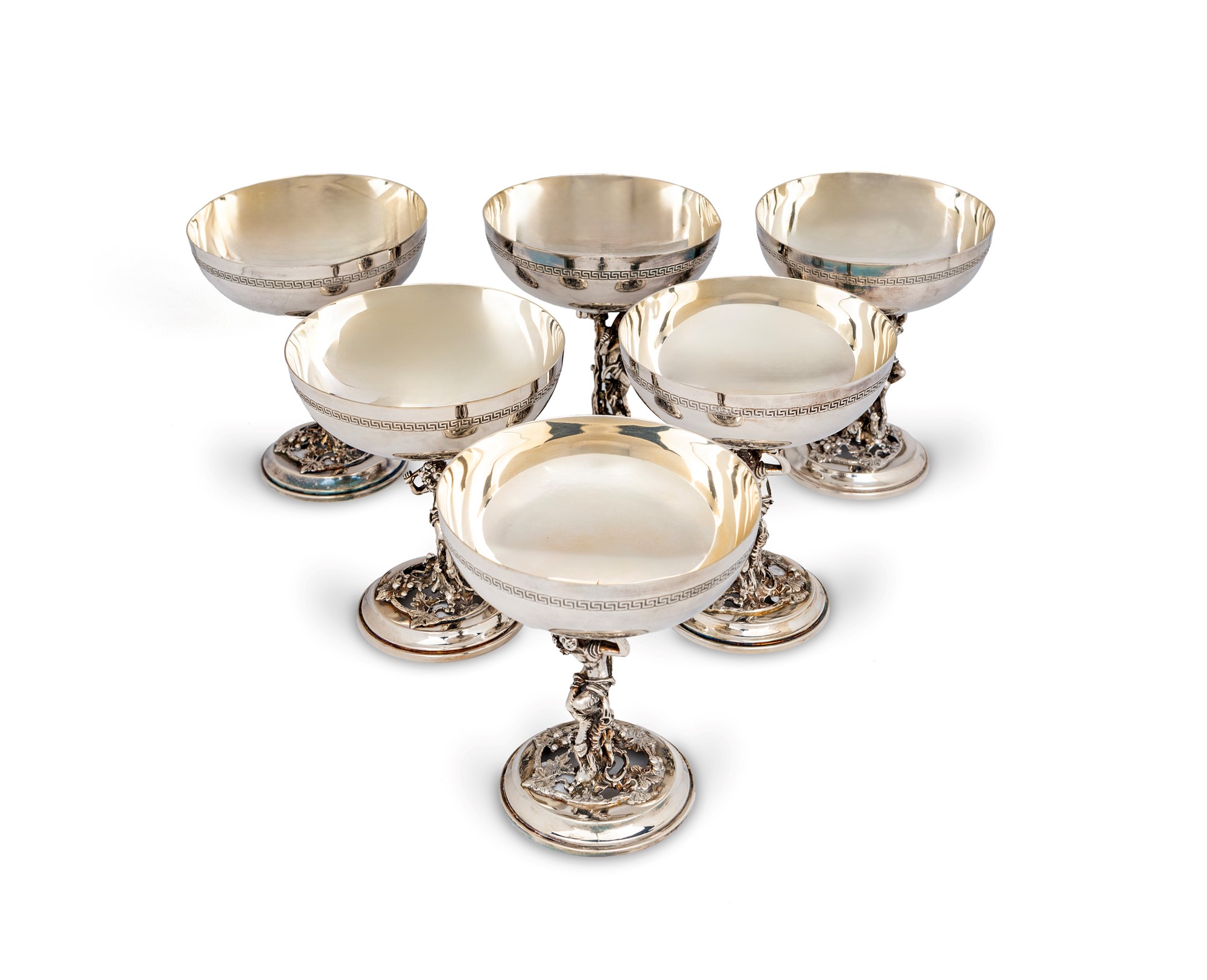 Sei coppe da champagne con steli scultorei in forma di albero con figura di fauno; coppa ornata da greca incisa, piede circolare altezza cm 12 - peso complessivo gr. 1230 argento