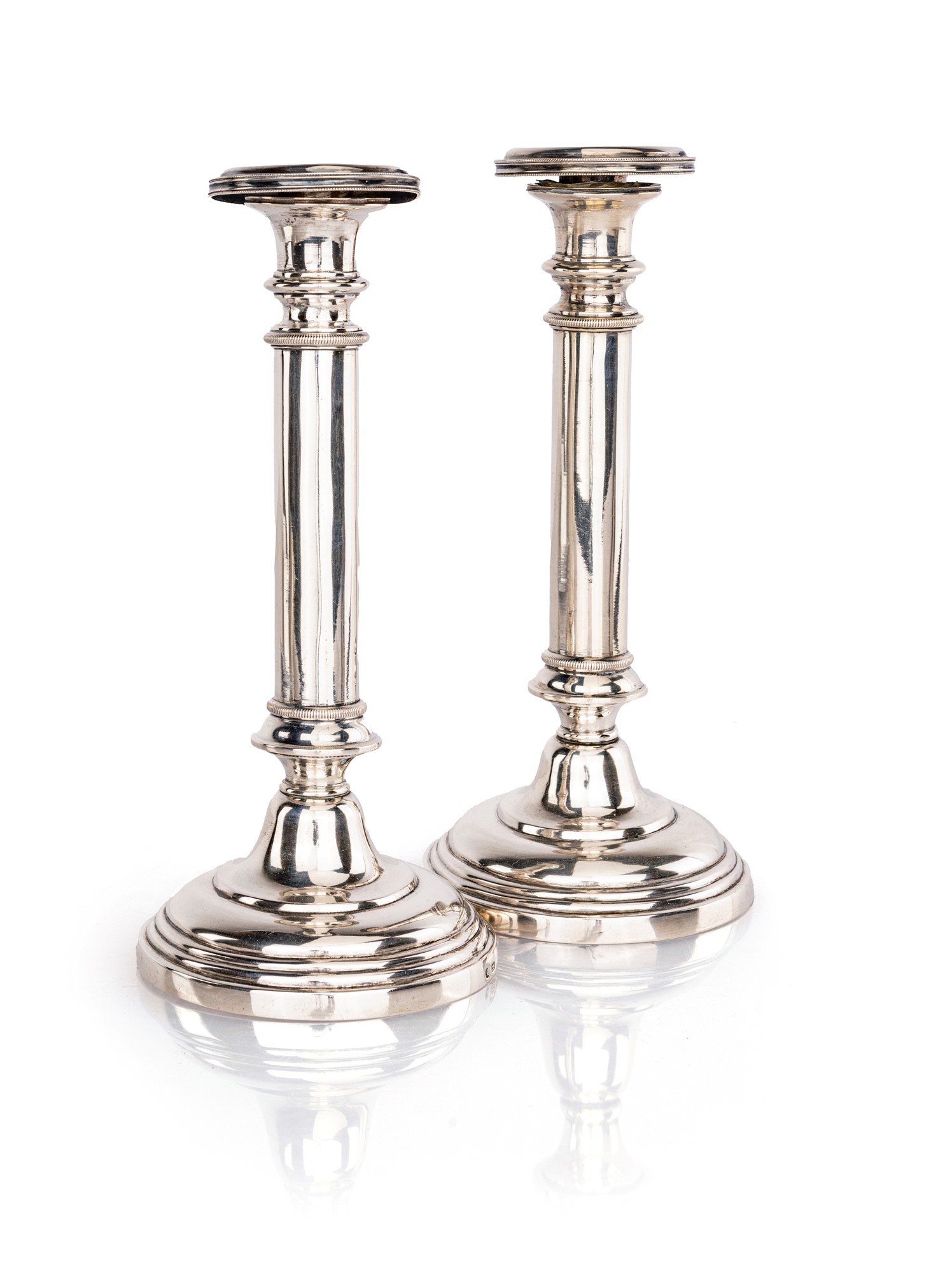Coppia di candelieri in argento, Firenze 1830, argentiere G.B. fusto a colonna con portacandela a vaso e bobèche estraibile, piede circolare gradinato altezza cm 24,5 - gr. 800 argento