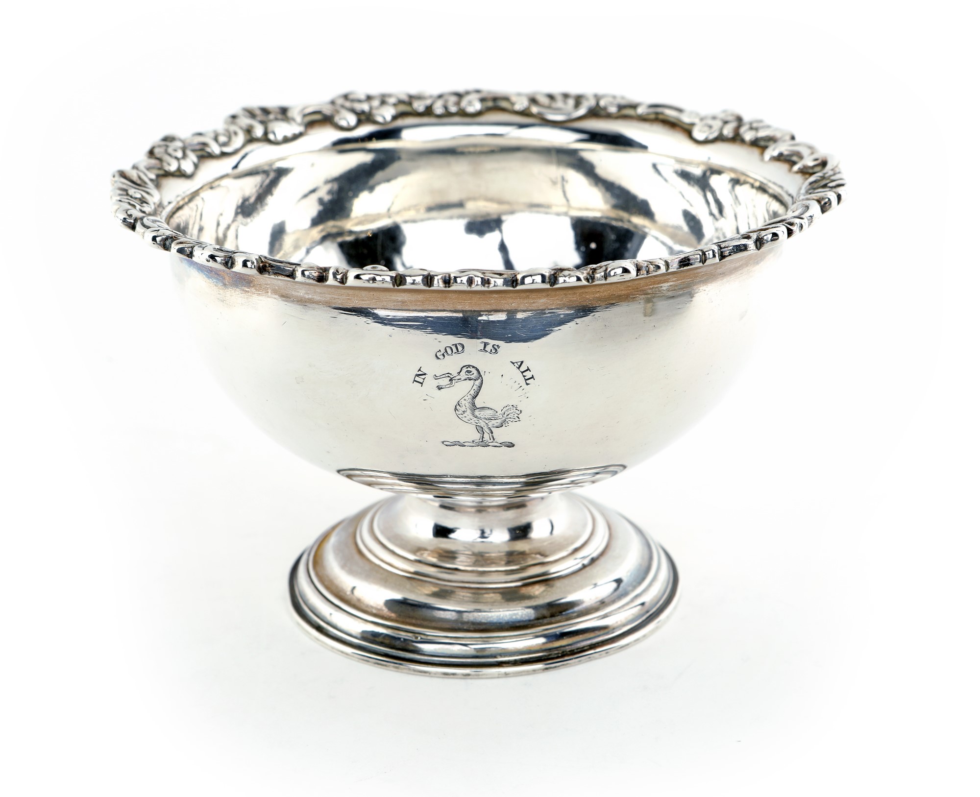 Coppa in argento, Londra 1748, orafo Alexander Johnston orlo percorso da rilievi vegetali, corolle e conchiglie; al centro una figura di struzzo con ferro di cavallo incisi e motto "In God is All"; piede circolare gradinato cm 9,5x15 - gr. 418