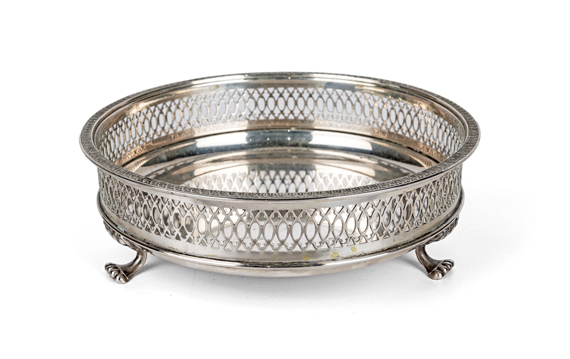 Vaschetta circolare racchiusa da ringhierina traforata, tre piedi a zampa ferina cm 6x19 - gr. 356 argento