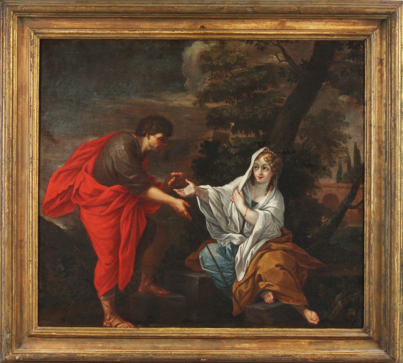 ARTISTA ROMANO DEL XVII SECOLO Giuda e Tamar. Olio su tela . Cm 81,50 x 72,50. Relazione di Perizia a cura di Daniela Rosati con attribuzione a Ciro Ferri. Cornice presente