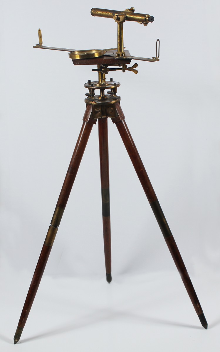 MANIFATTURA ITALIANA DEL XIX SECOLO Livello a canocchiale. Tecnica mista e assemblaggio. . Livello a canocchiale e livello mobile provvisto di cerchio orizzonatale e un settore graduato verticale nonchè di tre piede in legno e ottone. Strumento di misurazione topografica del XIX sec. Il cannocchiale può girare,