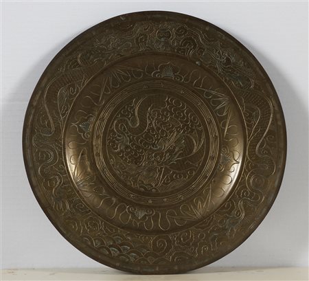 ANONIMO Senza titolo. Bronzo. Cm 25,00 x 25,00. Firmato.Piatto in bronzo, zona Cina.