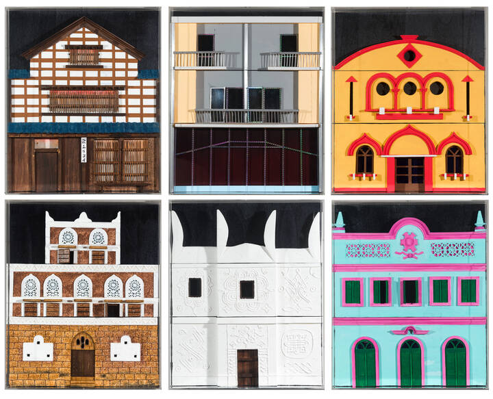 61x51 (teca), sei modelli di architetture etniche entro teca in plexiglass