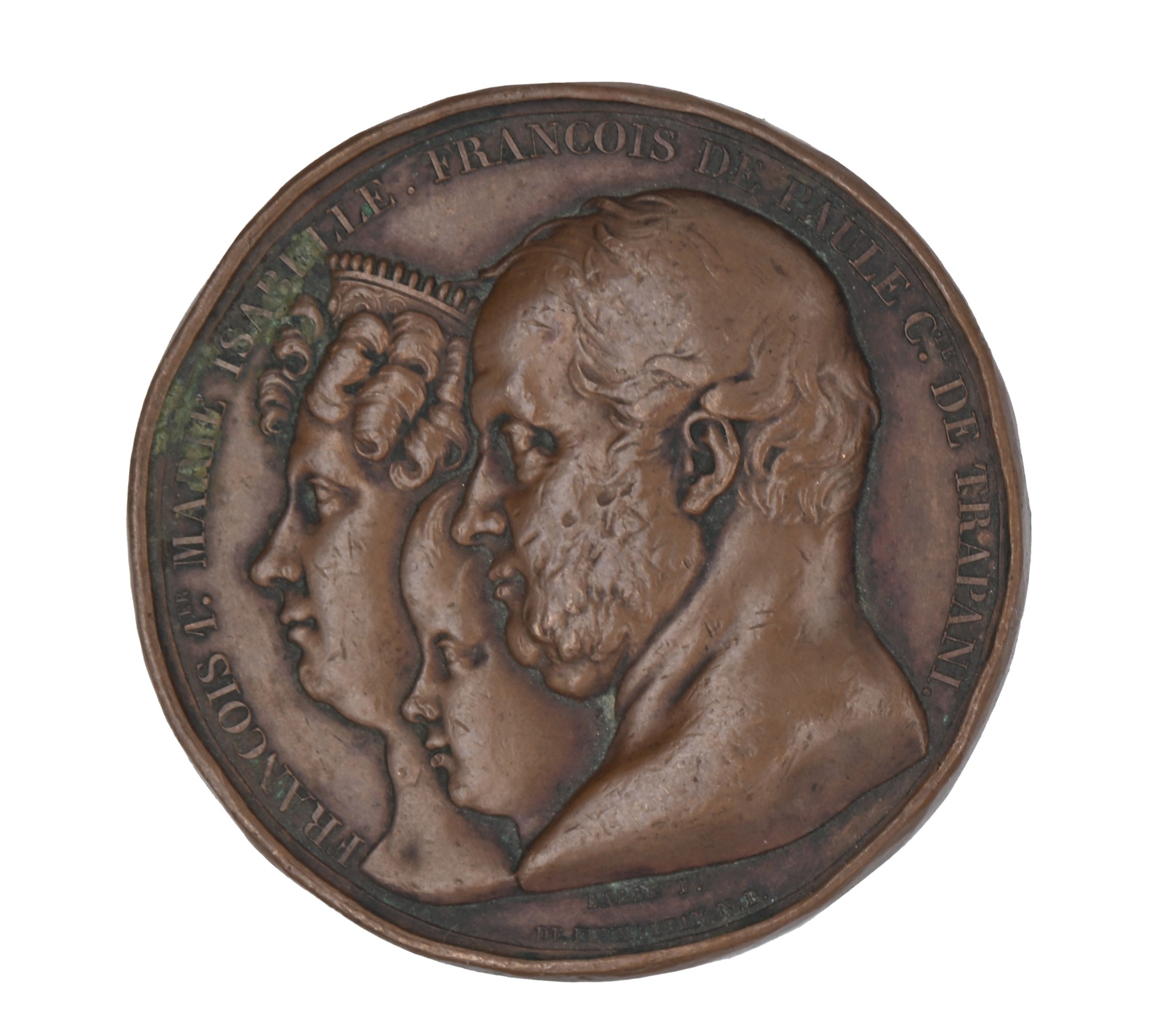 Jean Jacques Barre, Jean Pierre Casimir De Marcassus De Puymaurin - Francesco I di Borbone Medaglia emessa per ricordare il Convegno di Grenoble e la riunione degli undici membri della Famiglia dei Borbone D/ FRANCOIS I.er MARIE ISABELLE FRANCOIS DE PAULE C.TE DE TRAPANI Busti accollati dei Reali di Napoli R/ REUNION DE ONZE MEMBR.E DE LA FAMILLE DES BORBONS A GRENOBLE LE 31 OCT. 1829 Busti dei membri della famiglia. Peso 66,20 grammi. D'Auria 151; Ricciardi 142 Diam mm 51
