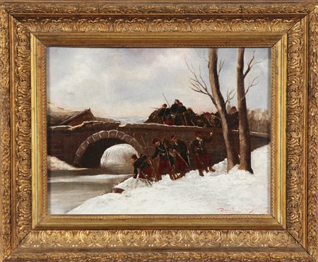 ARTISTA FRANCESE DEL XIX SECOLO Scena di battaglia. Olio su tela . Cm 33,00 x 25,00. D'apres Berne Bellecour. Cornice presente