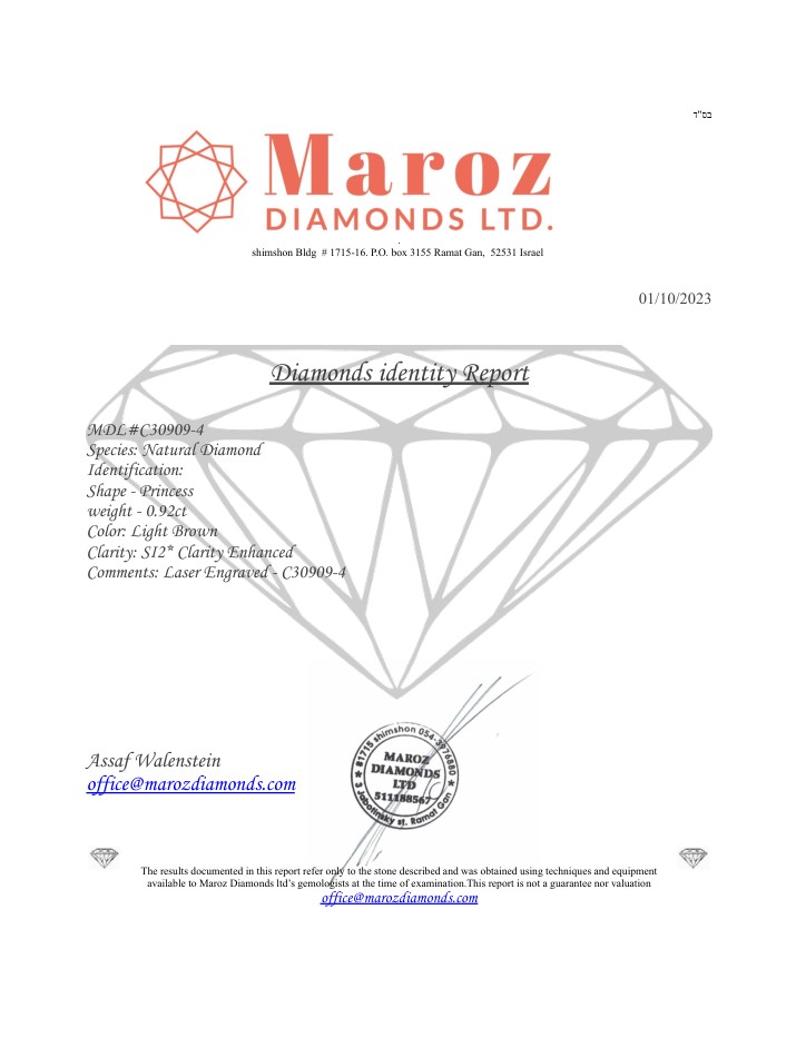 DIAMANTE PUREZZA ESALTATA* 0,92 CARATI NATURAL CHIARO MARRONE GIALLO - PUREZZA SI2 - TAGLIO PRINCESS - CERTIFICATO GEMMOLOGICO MAROZ DIAMONDS LTD MEMBRO ISRAEL DIAMOND EXCHANGE - C30909-4