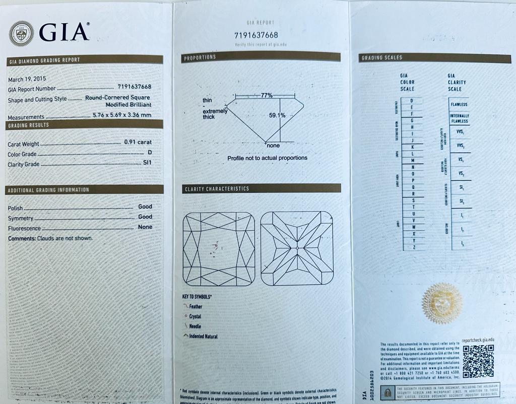 DIAMANTE 0,91 CARATI COLORE D - PUREZZA SI1 - TAGLIO CUSCINO - CERTIFICATO GIA - MA30501