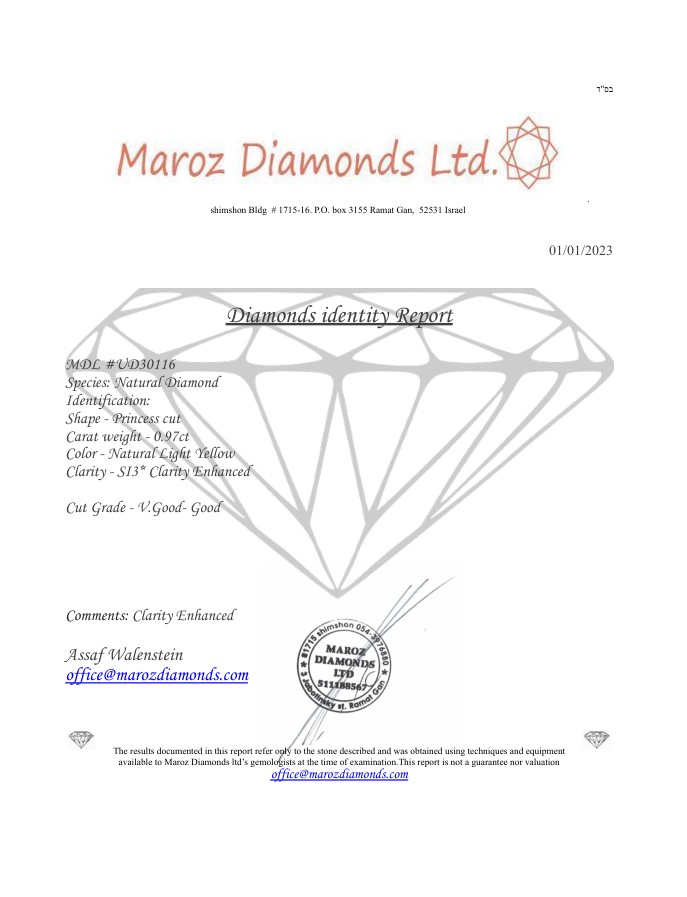 DIAMANTE NATURAL POLISHED 0,97 CARATI NATURAL GIALLO CHIARO - PUREZZA SI3* DIAMANTE PUREZZA ESALTATA - TAGLIO PRINCESS - CERTIFICATO GEMMOLOGICO MAROZ DIAMONDS LTD MEMBRO ISRAEL DIAMOND EXCHANGE - UD30116
