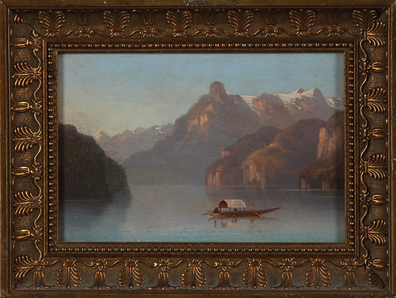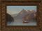 Lago alpino con barca. Olio su tavola. Cm 13,00 x 9,00. . Cornice presente